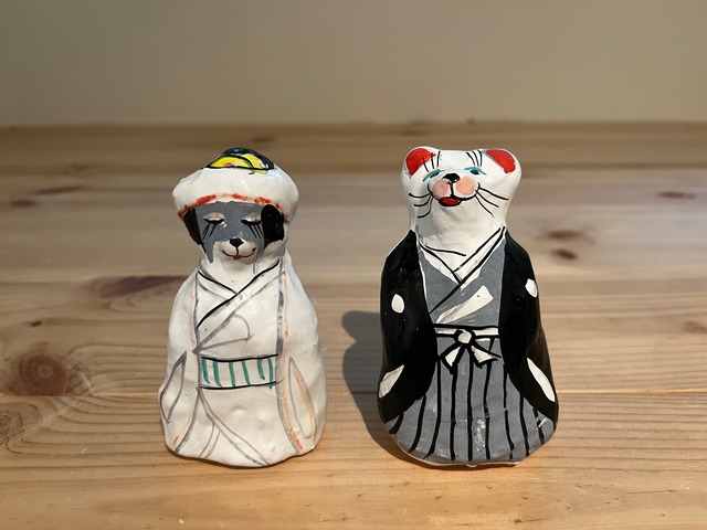 楽しそうな表情を浮かべるトラと牛のひな人形。春らしい着物を身にまとった華やかな作品。 ▪︎サイズ 左:縦約6cm、横約9cm、厚さ約4cm 右:縦約6cm、横約8cm、厚さ約5cm ▪︎特記事項 ・本サイトで扱う商品は、長年職人さんの工房で保管されていたデッドストックです。手作りのもので長年の保管による経年変化で、商品によっては多少の汚れやくすみ等があることをご理解いただけますと幸いです。 ・本サイトで扱う商品はデッドストックのため、現行品より低価格で提供しております。 ・別の仕事しながらのショップ運営になるため、配送には時間がかかる場合がございます。ご理解いただけますと幸いです。