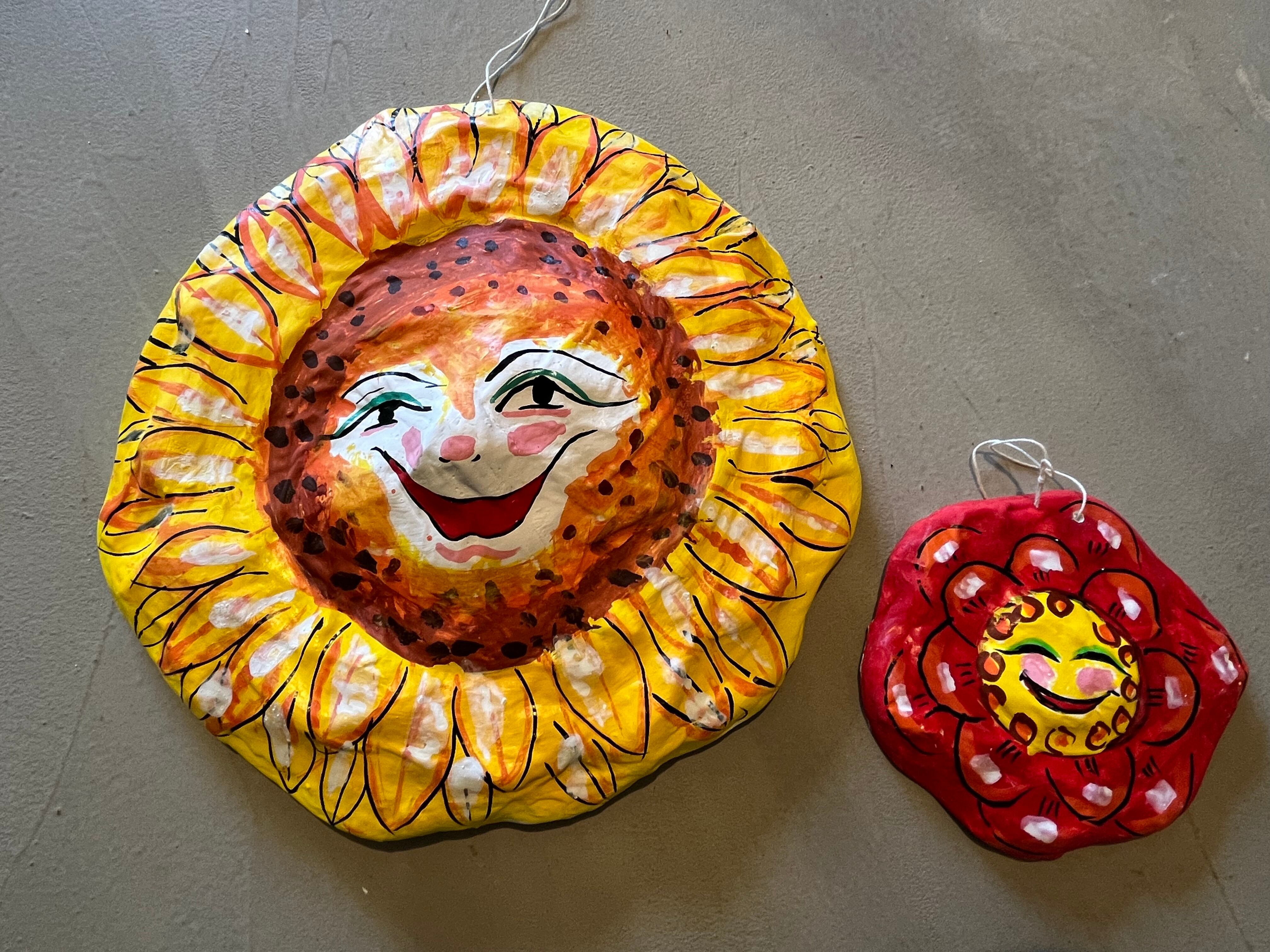 ヒマワリの妖精と、赤花の妖精の壁掛けお面。。非常に繊細なデザインで、見ているとパワーがみなぎる作品です。