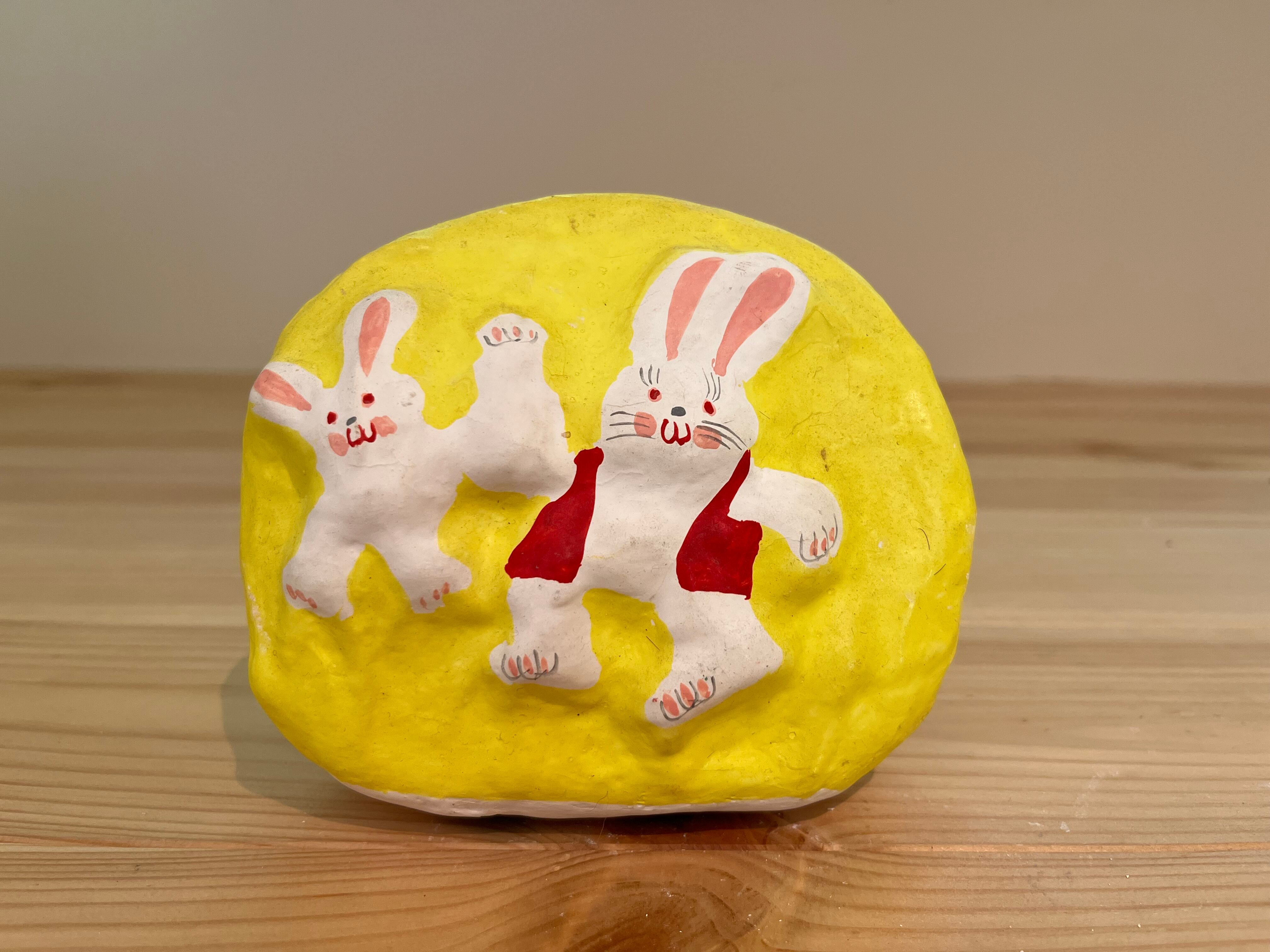 まん丸の満月の中で元気に踊る2匹のうさぎ。餅つきせず踊っているのがユニークですよね。