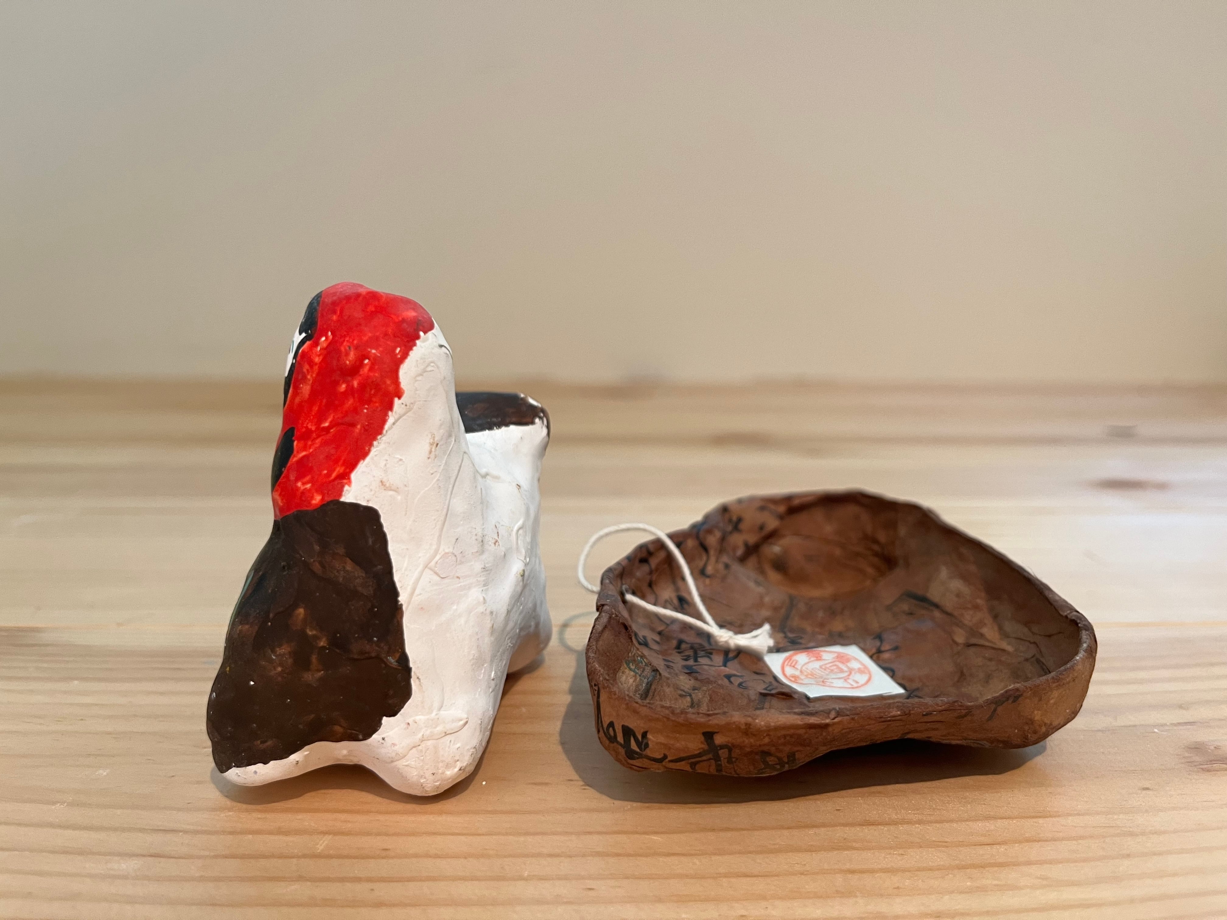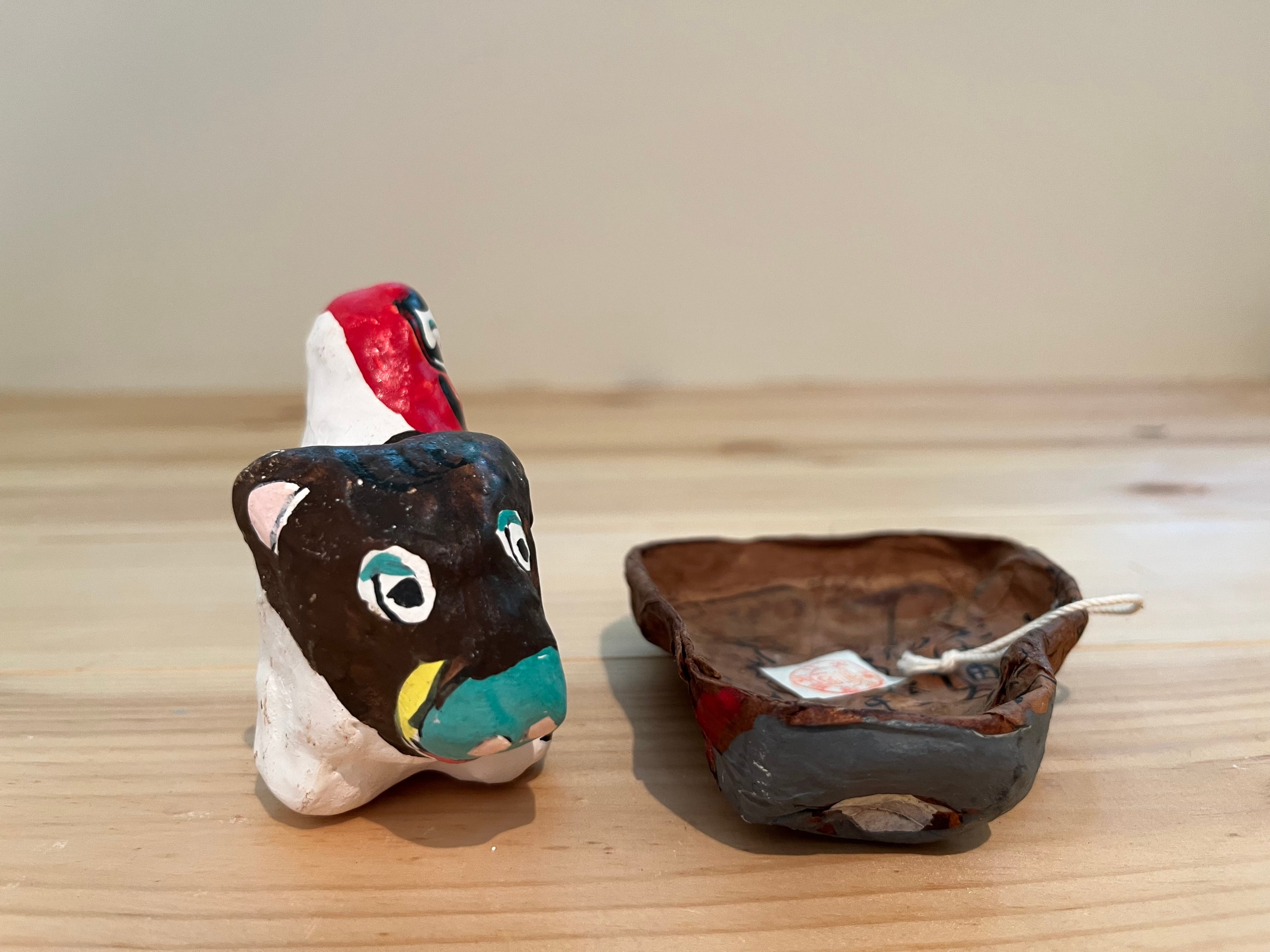 右の面は、表面を胡粉ではなく柿渋で仕上げた珍しい作品。通常の張り子との質感の違いや、より軽いのが特徴です。下の和紙の文字が透けて見えるのも面白いです!