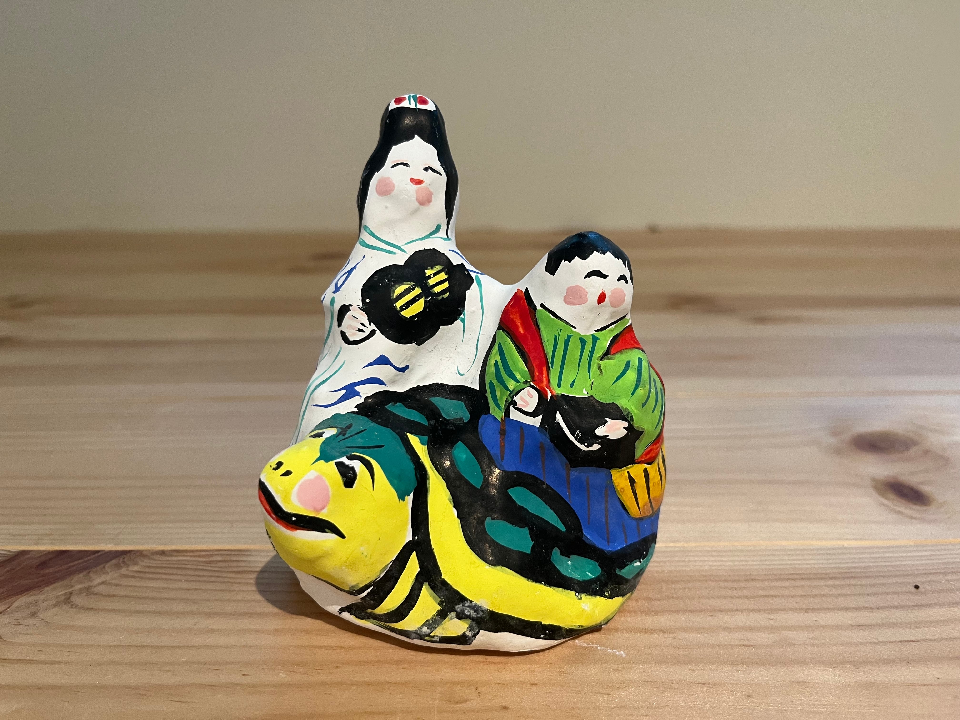 日本昔ばなし「浦島太郎」の亀に乗って竜宮城へ行くシーン。かわいい乙姫も描かれています。