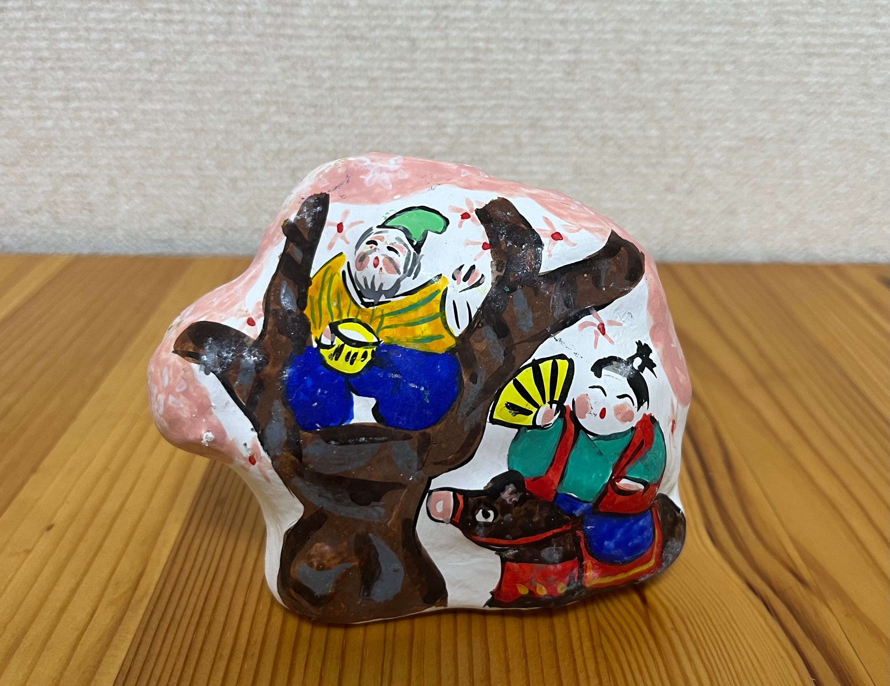 日本昔ばなし「花咲か爺さん」の正直者の爺さんが木に灰をまいたら花が咲き、たまたま通りかかった殿様が感動し褒美をやるというシーン。