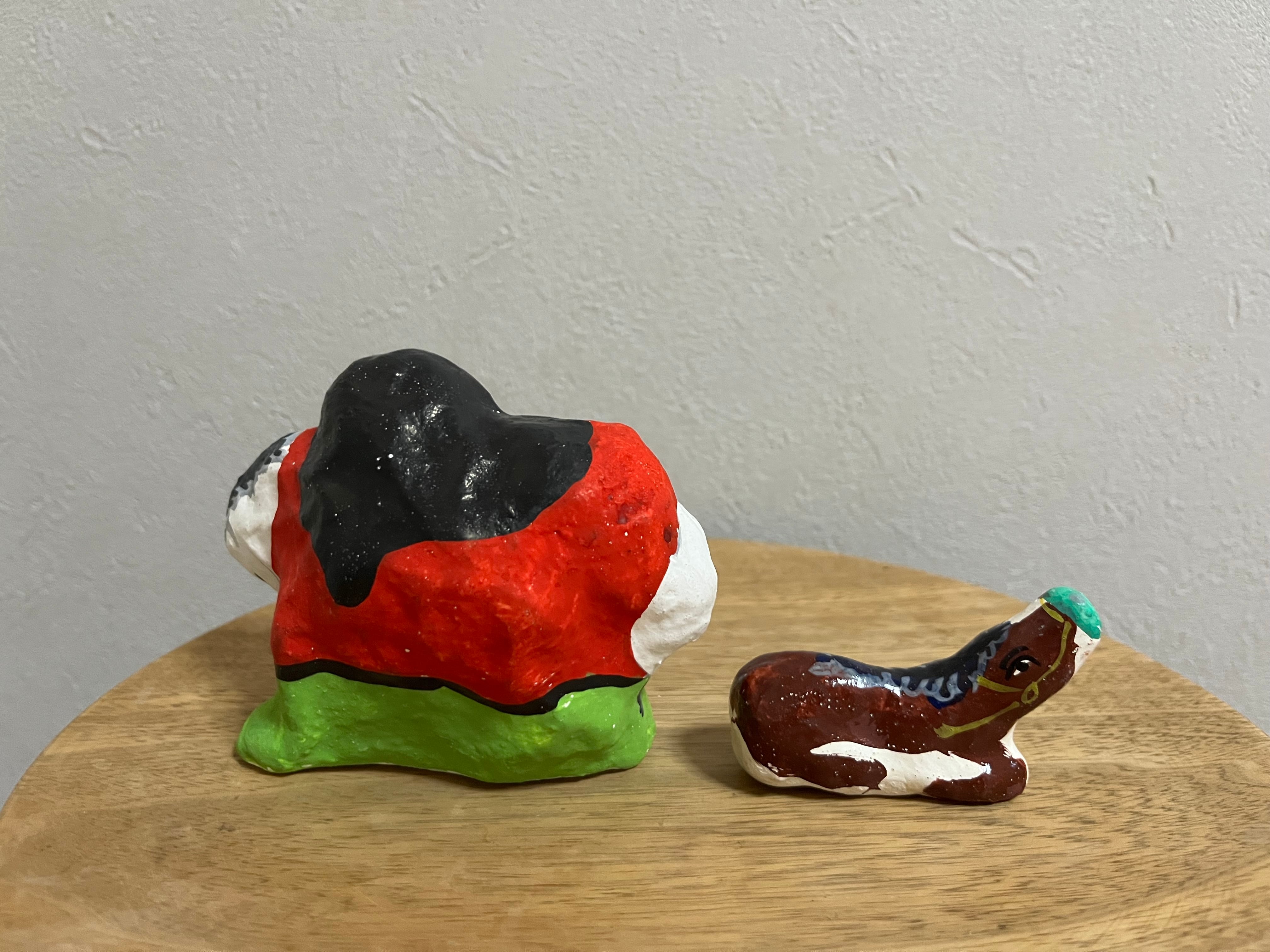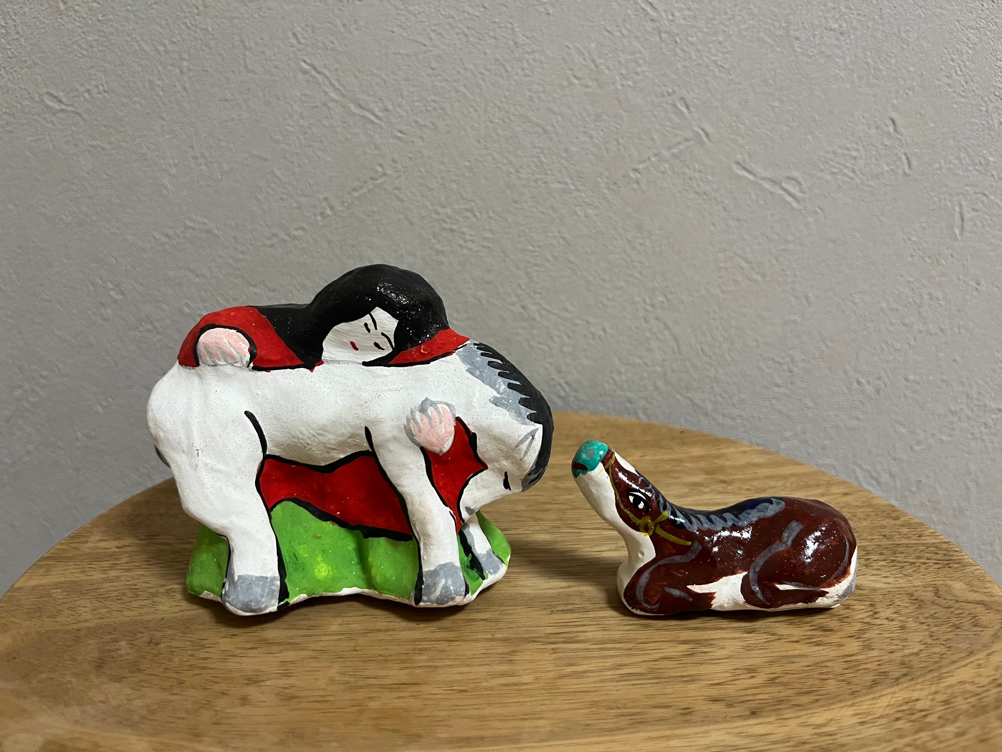 なんとなくグッタリとした白馬を抱き抱える女の人。「スーホと白い馬」を彷彿とさせます。その様子を優しく見守る茶色い仔馬。