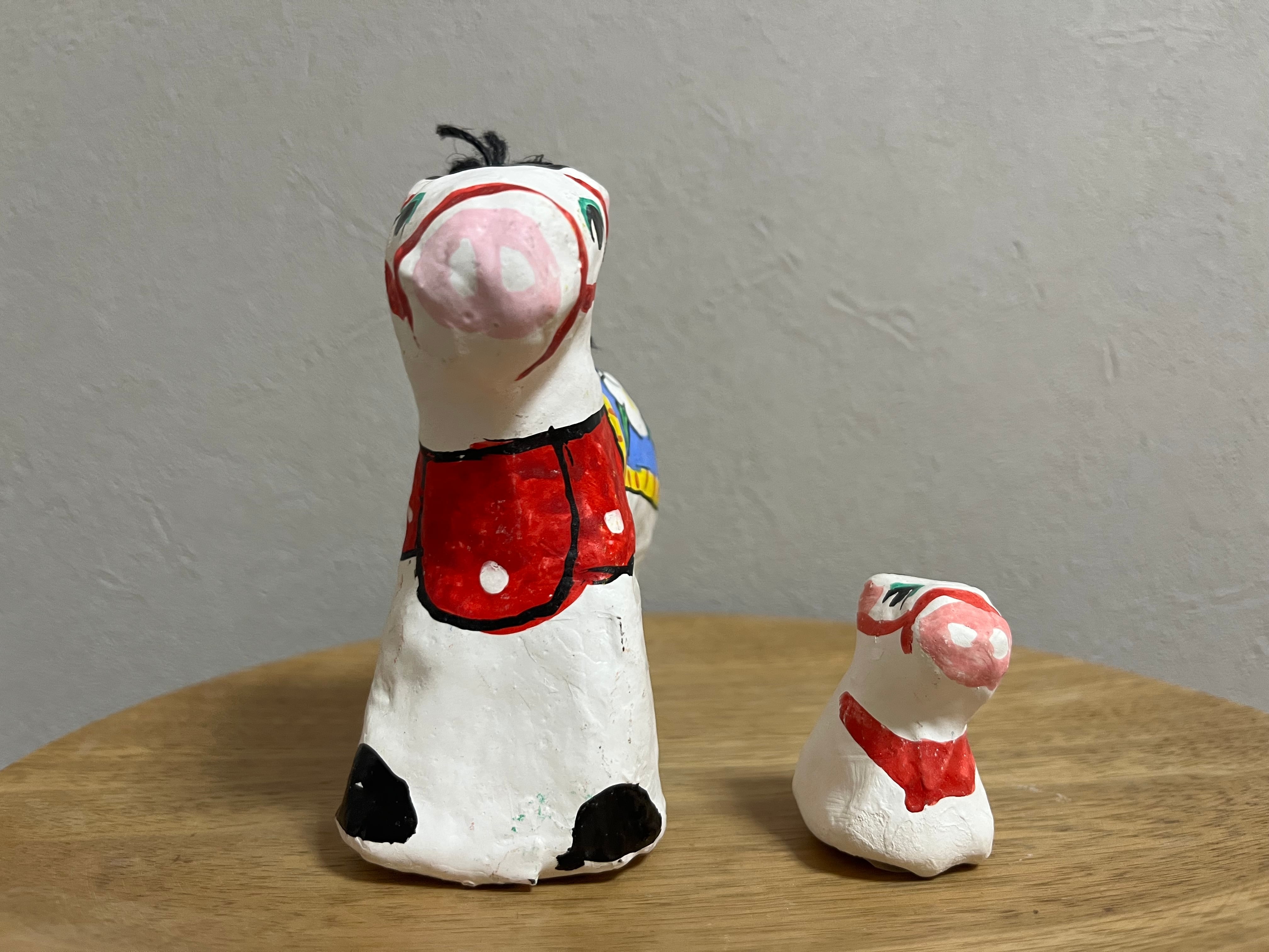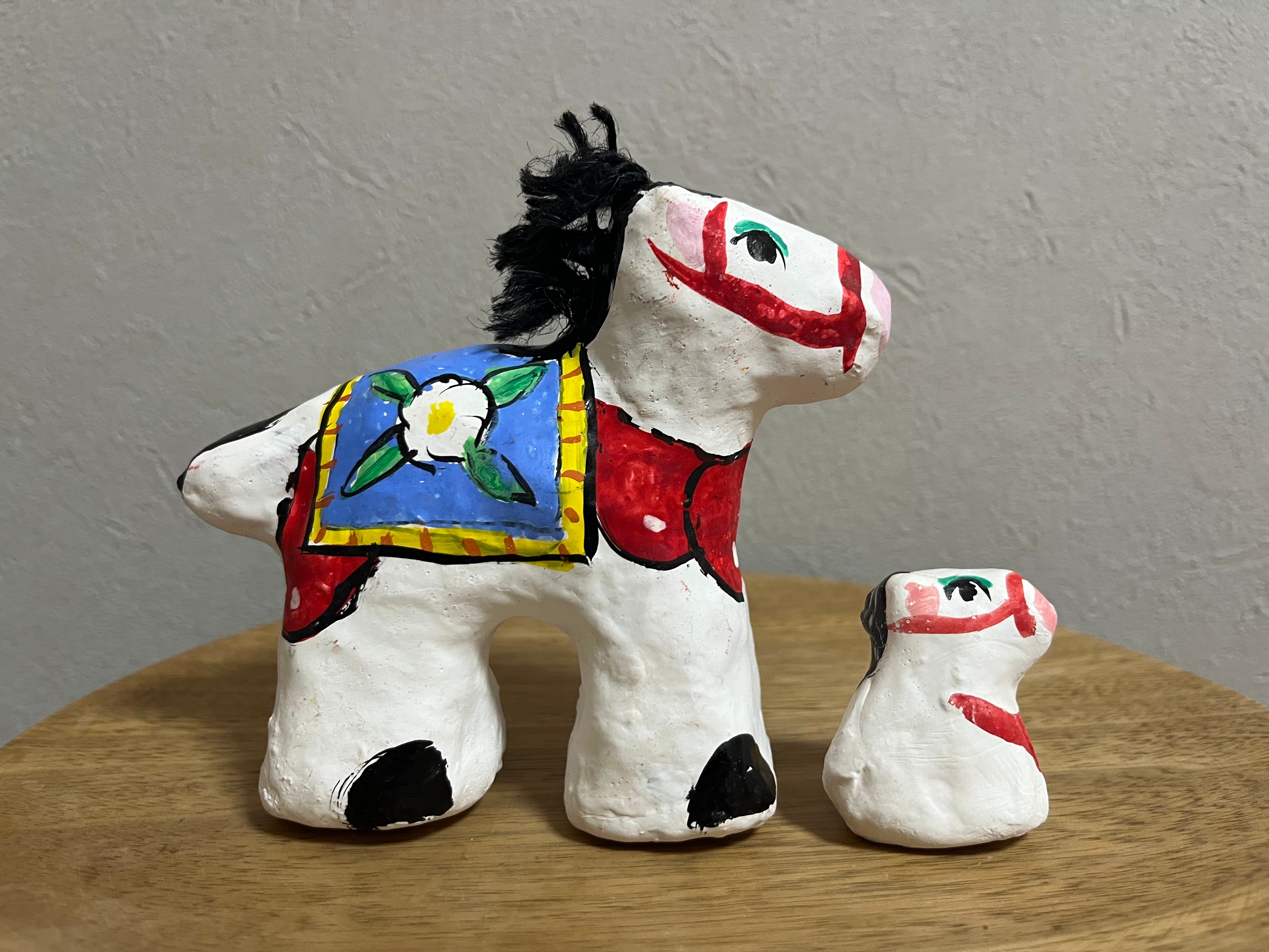 赤や花柄の華やかな馬具が、白馬の美しい体にとっても映えています。須磨張り子の特徴のブルーグリーンのアイラインもとっても映えててキュート。