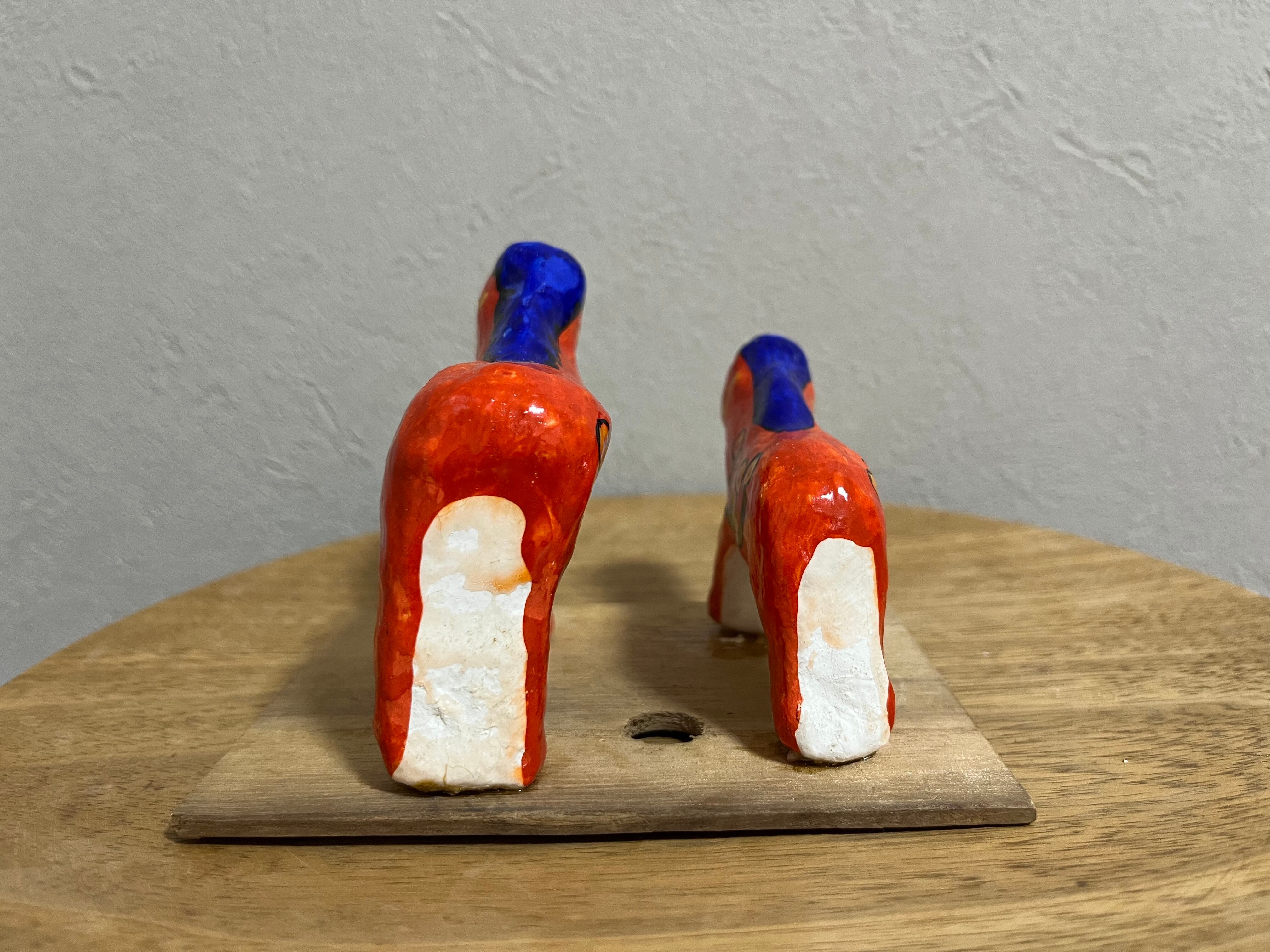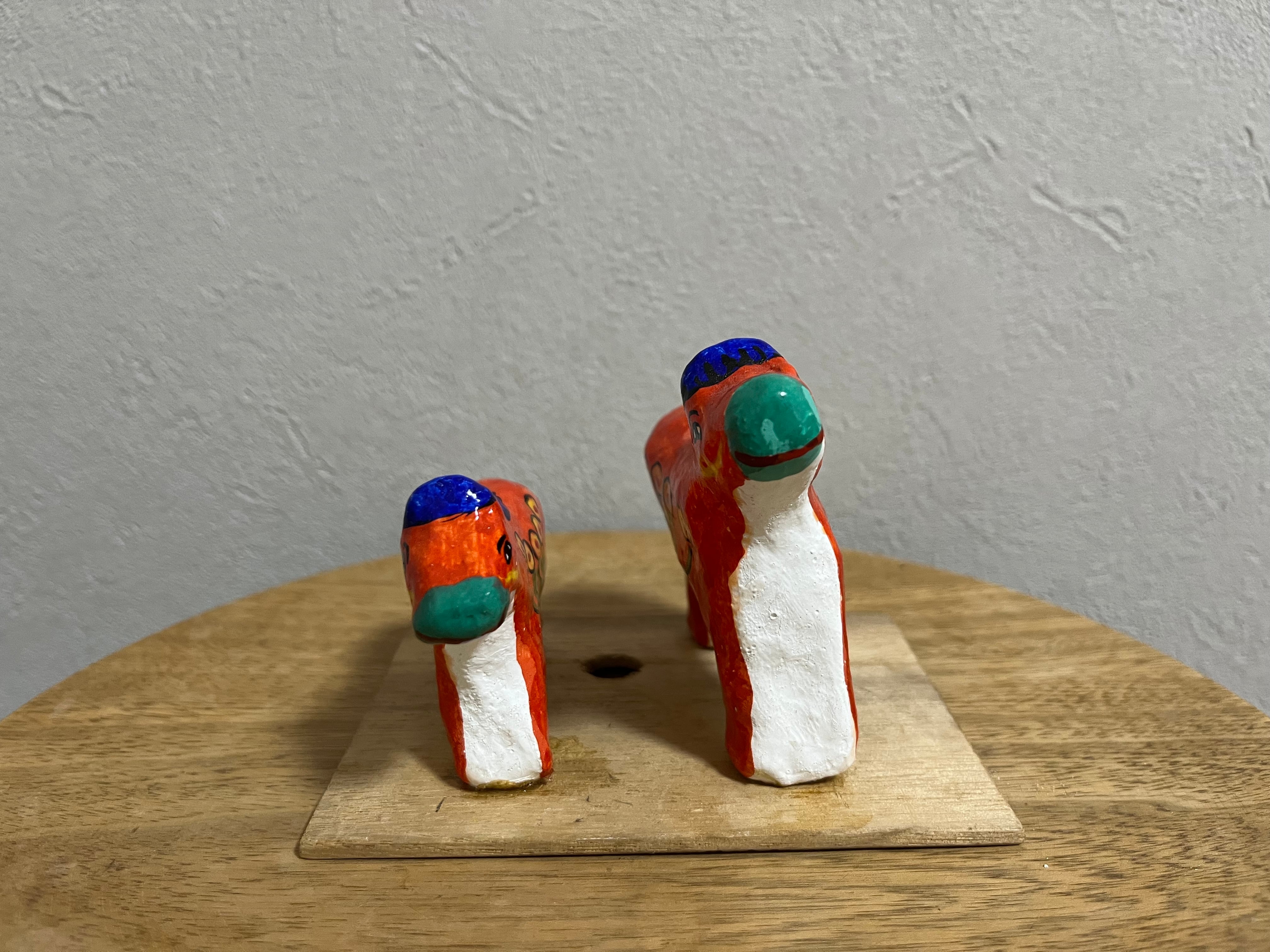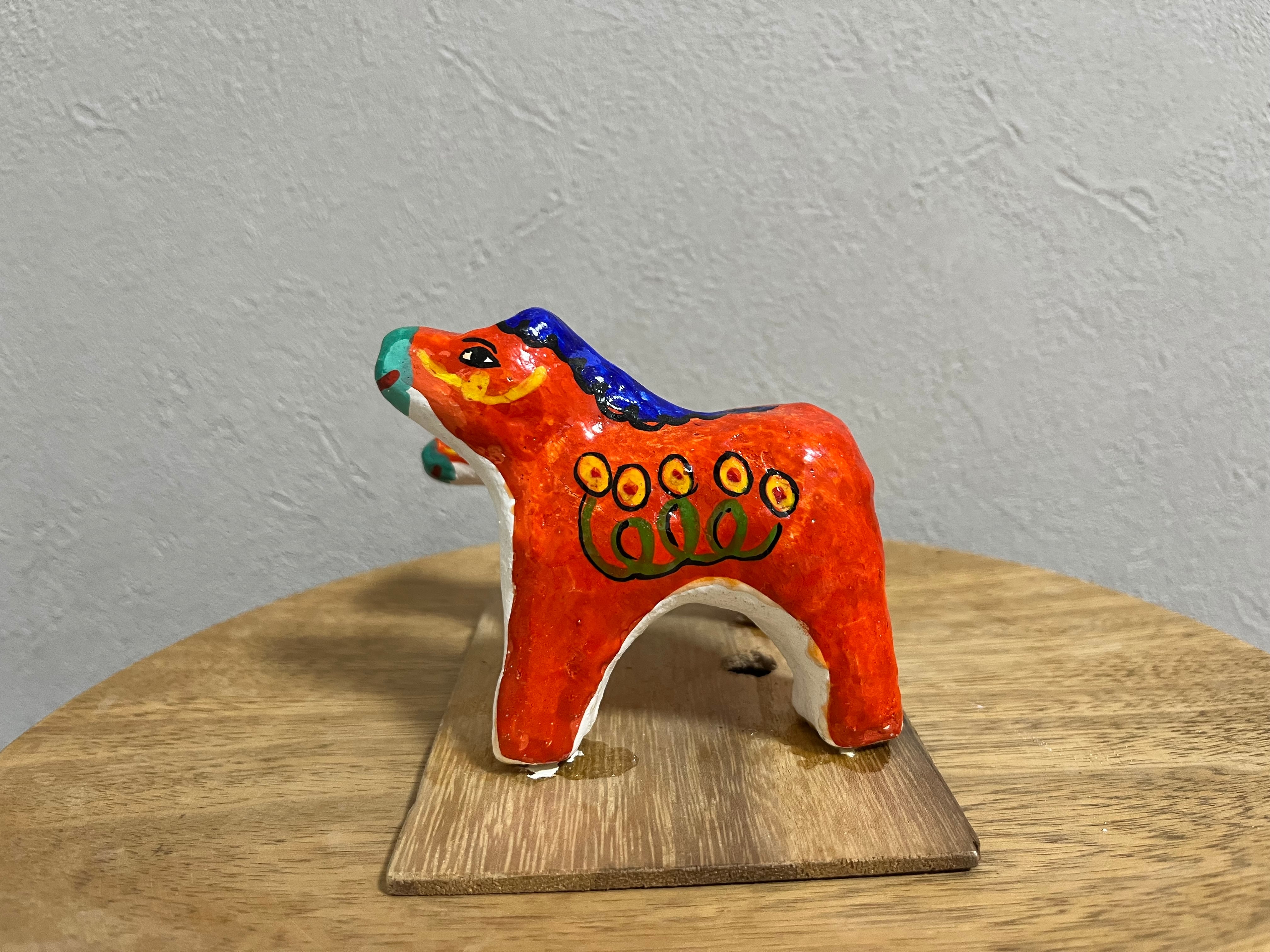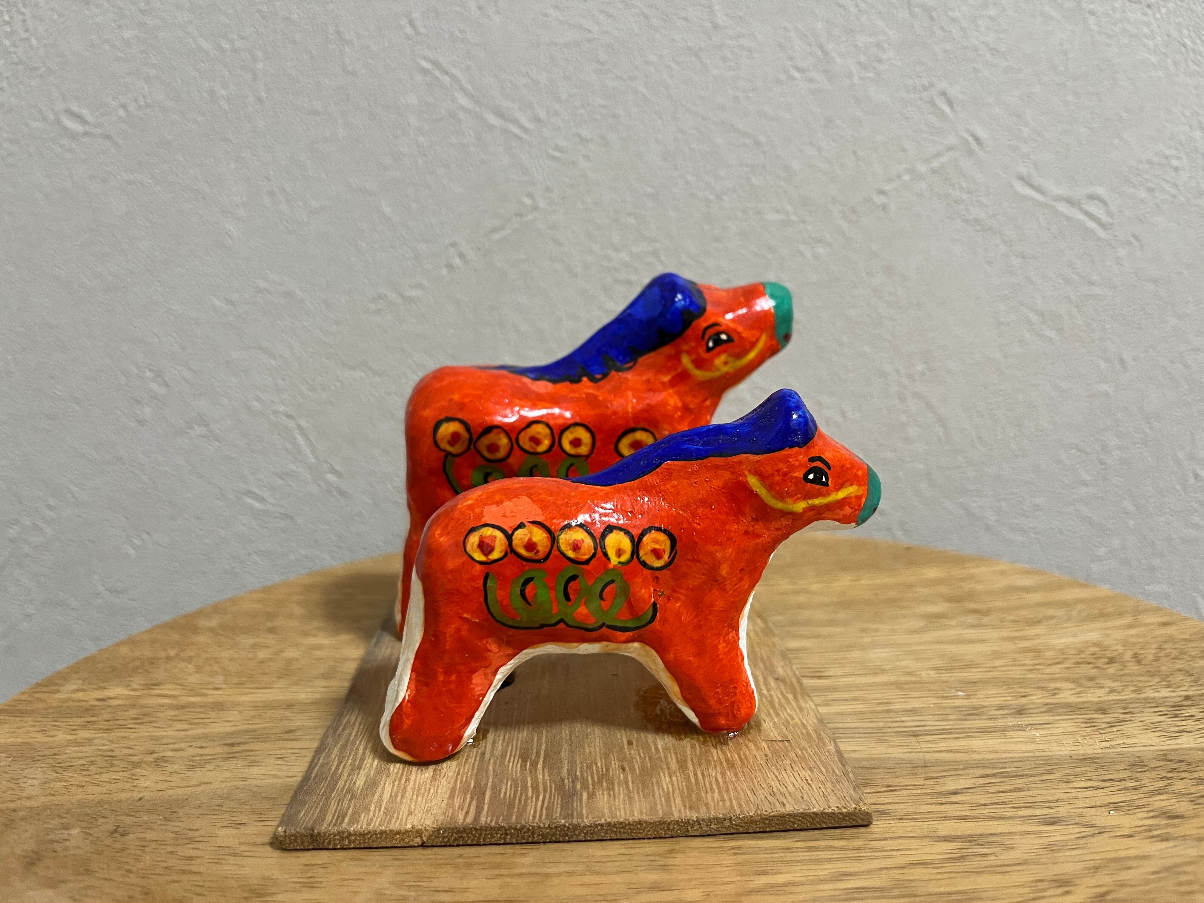 鮮やかなオレンジに青いタテガミ、体の模様も花のような異国情緒あふれるデザインの華やかな馬たち。