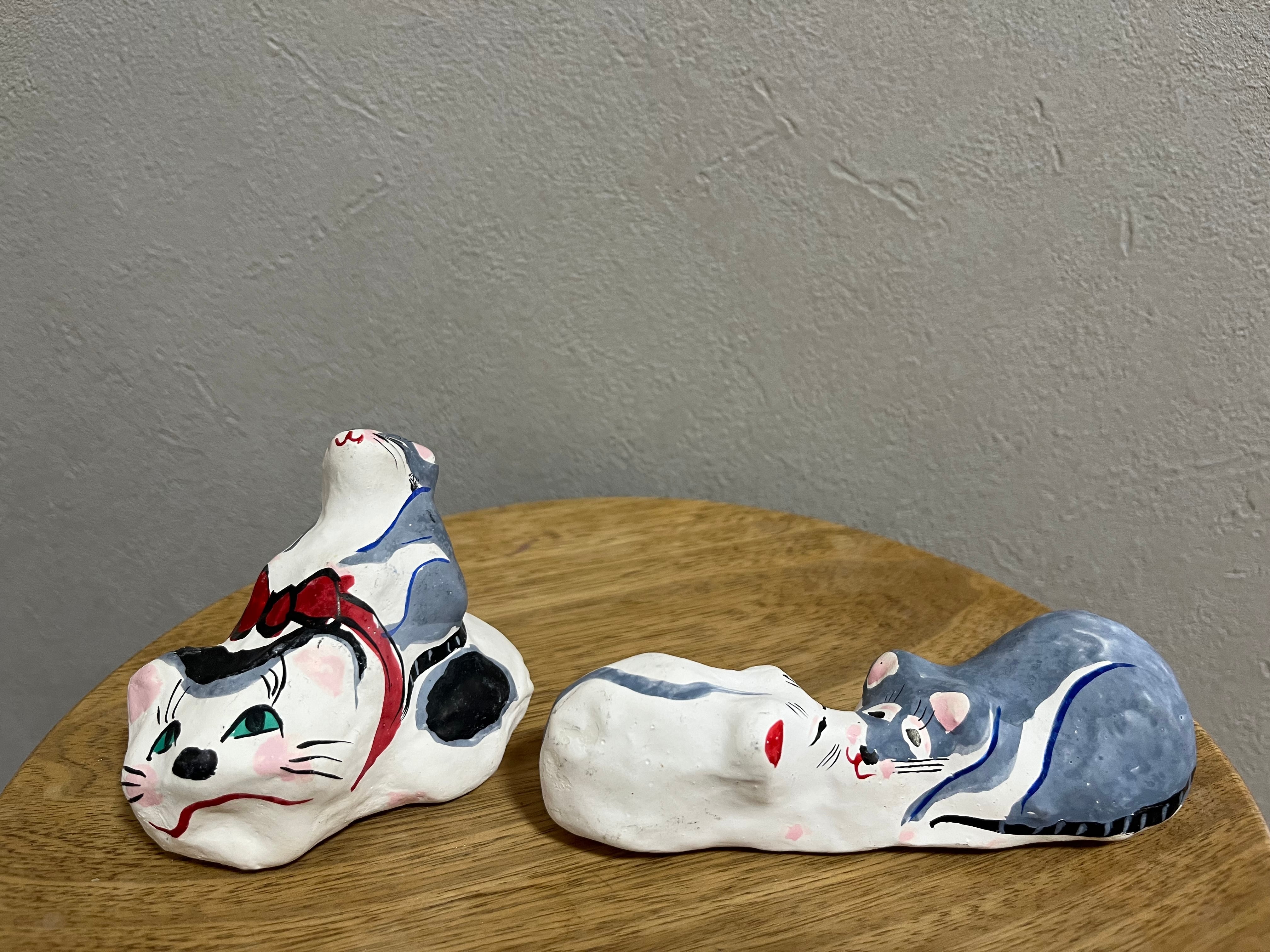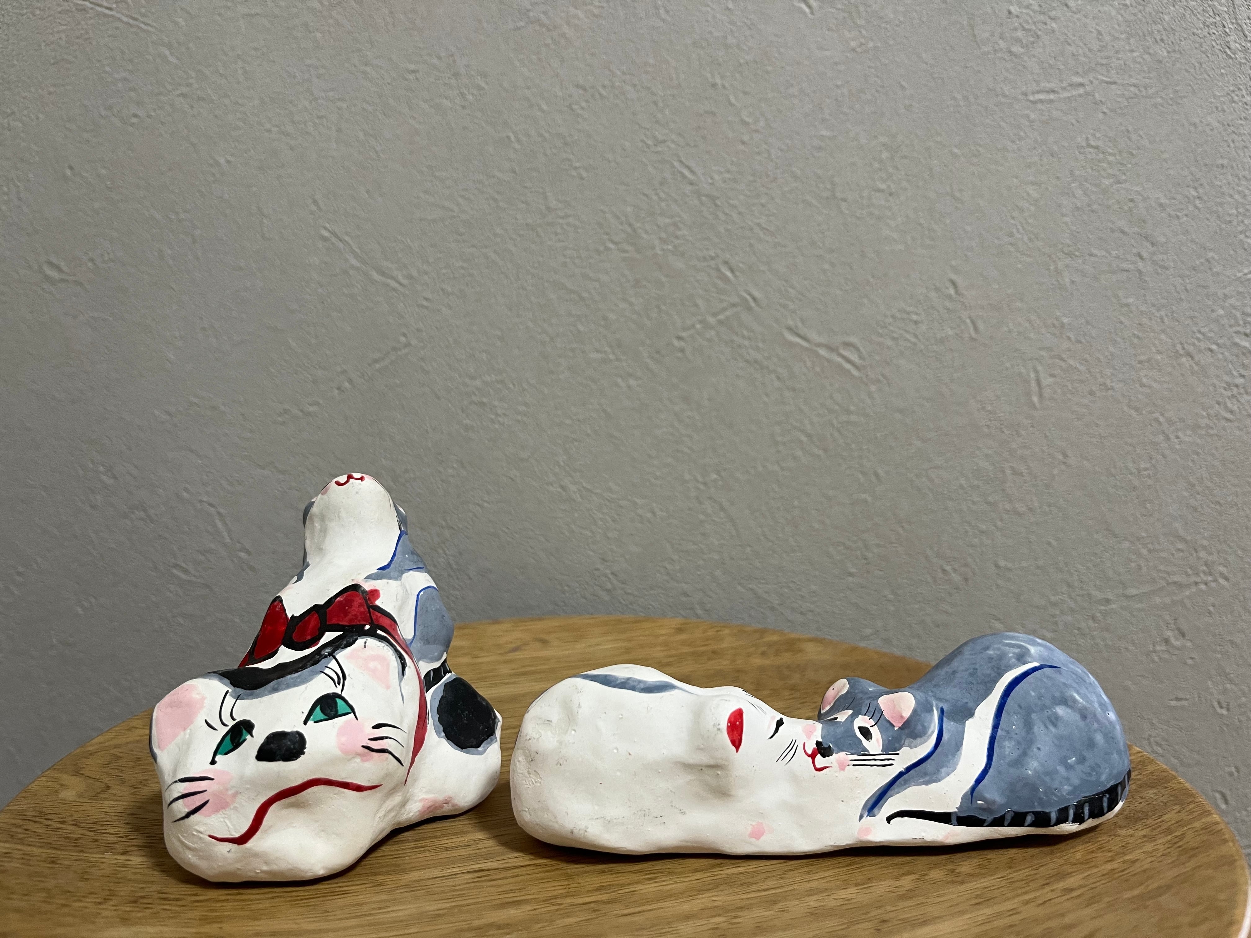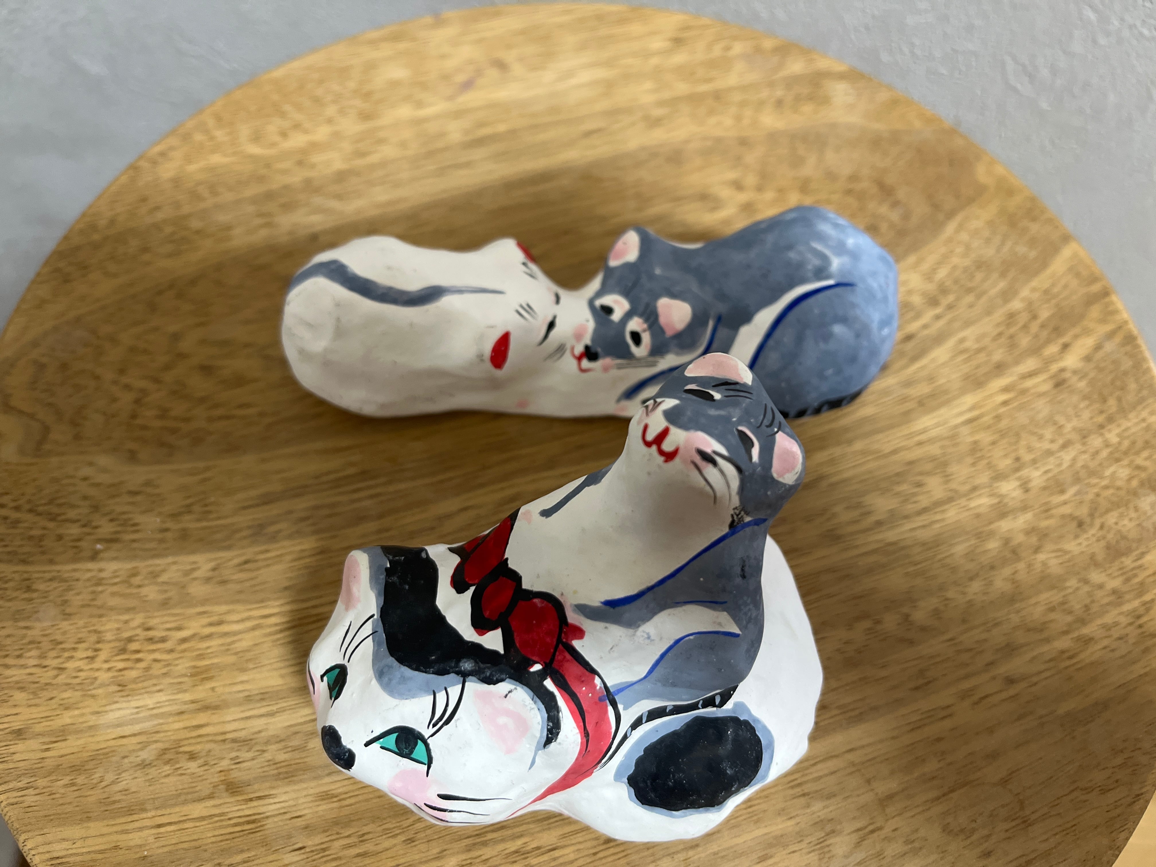 仲良しなネズミとネコ。赤い首輪を手綱のように持っているのがかわいいです。その横にはなかなかくっつく2匹のネズミが。