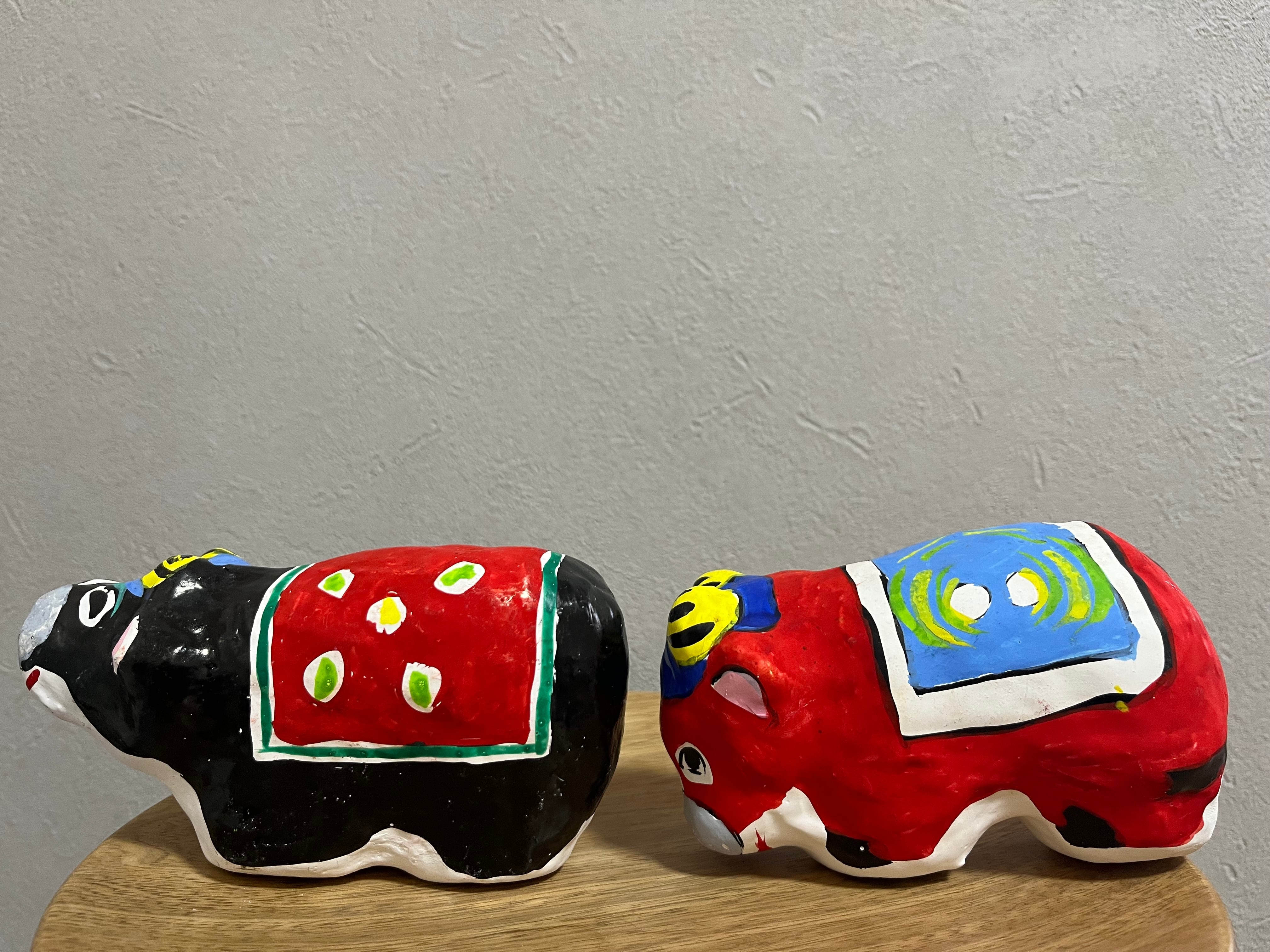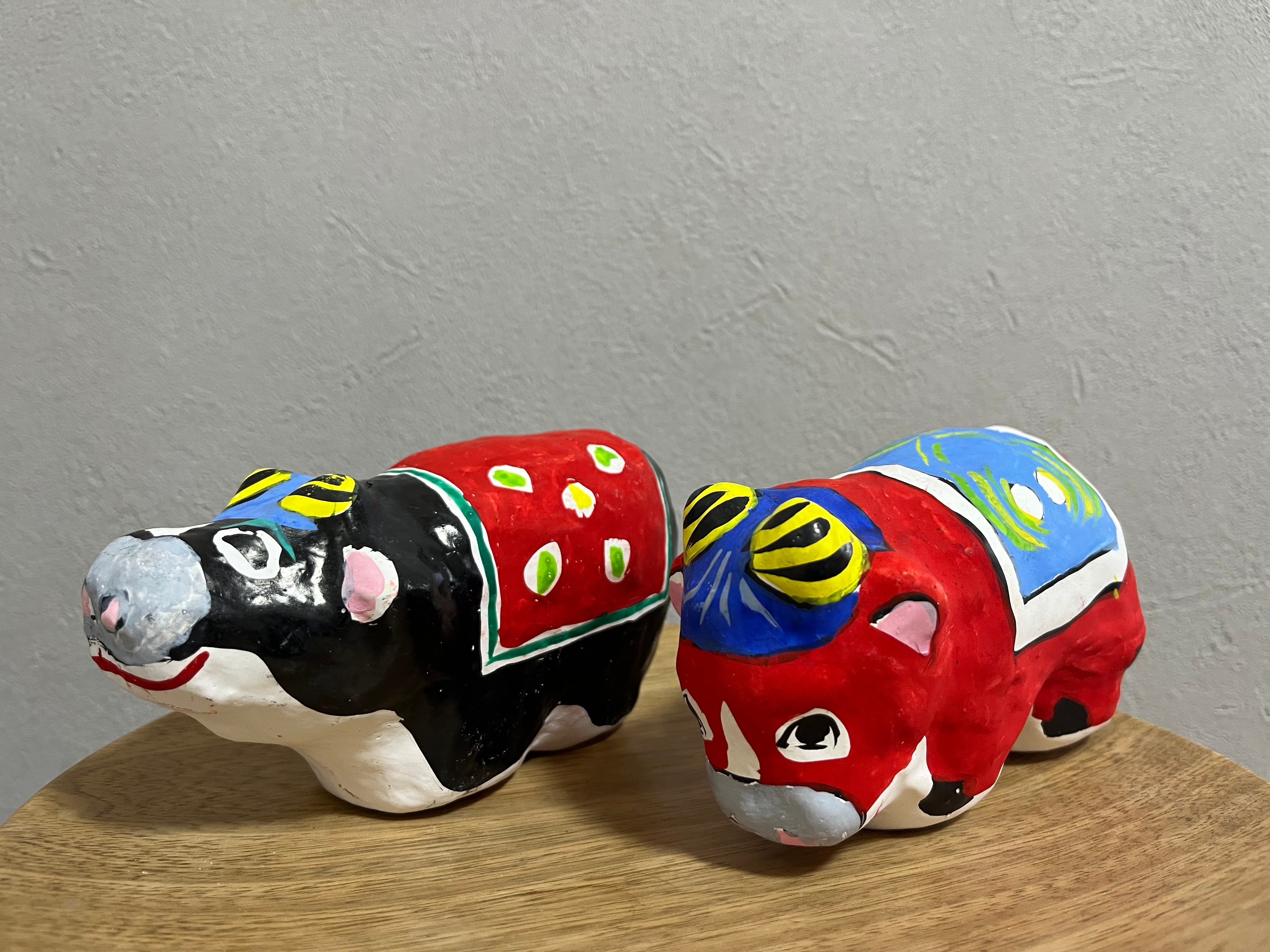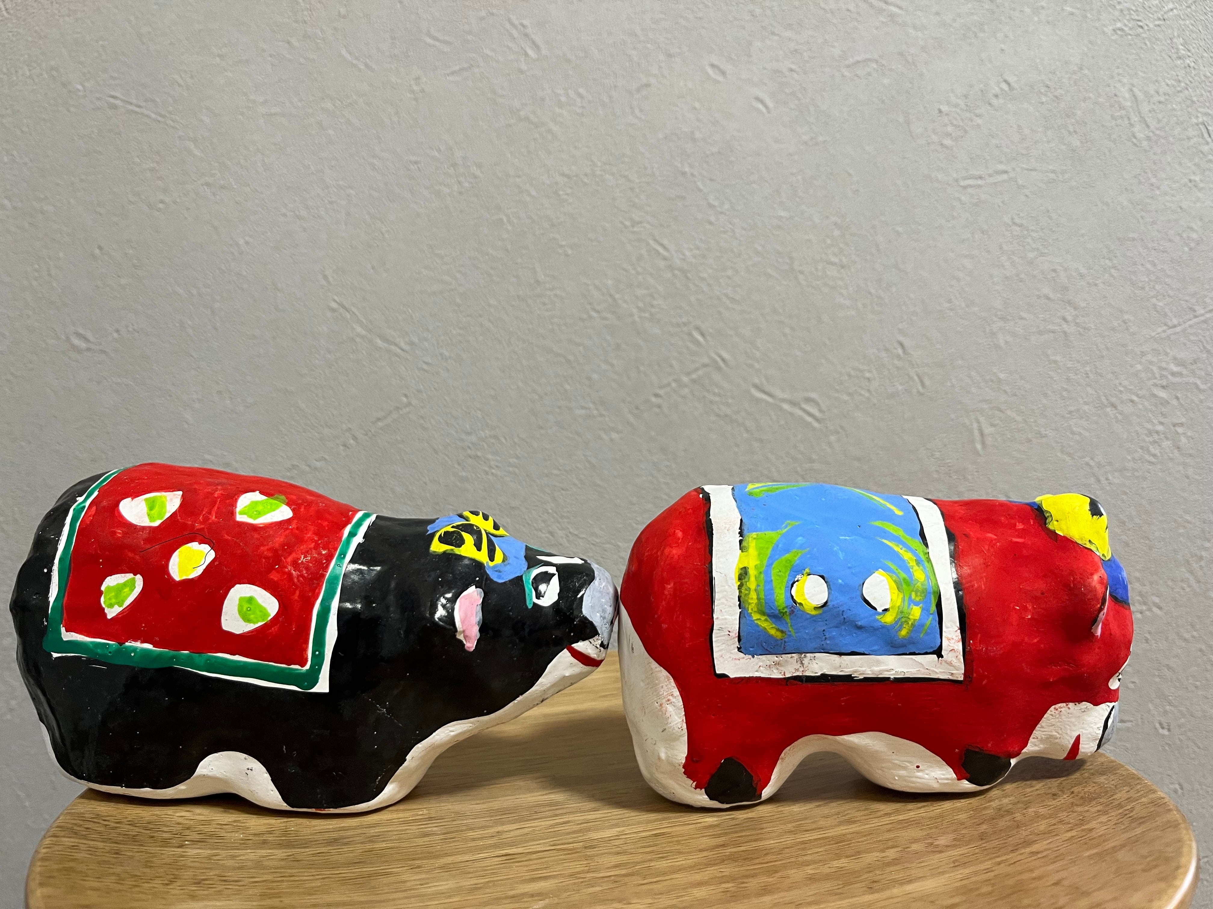 華やかな布をみにまとった赤牛と黒牛。赤い牛(赤べこ)は縁起物と言われています。