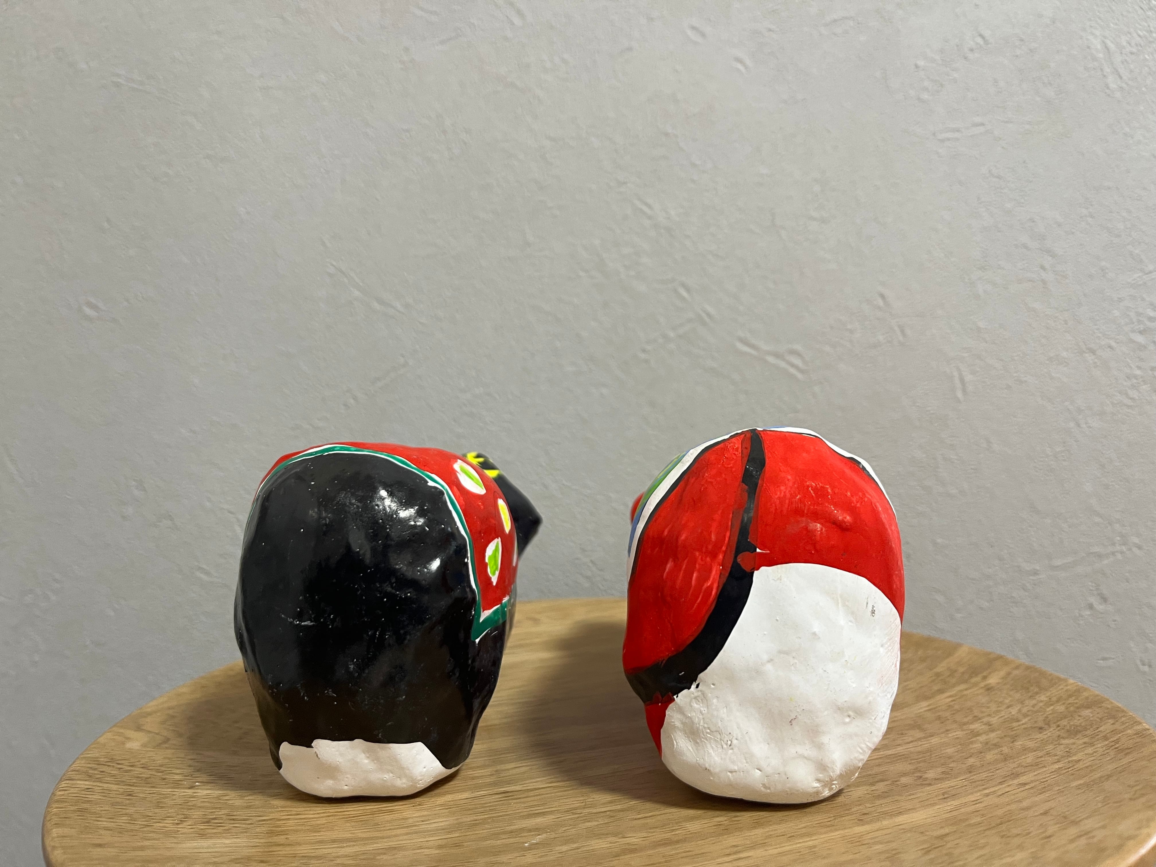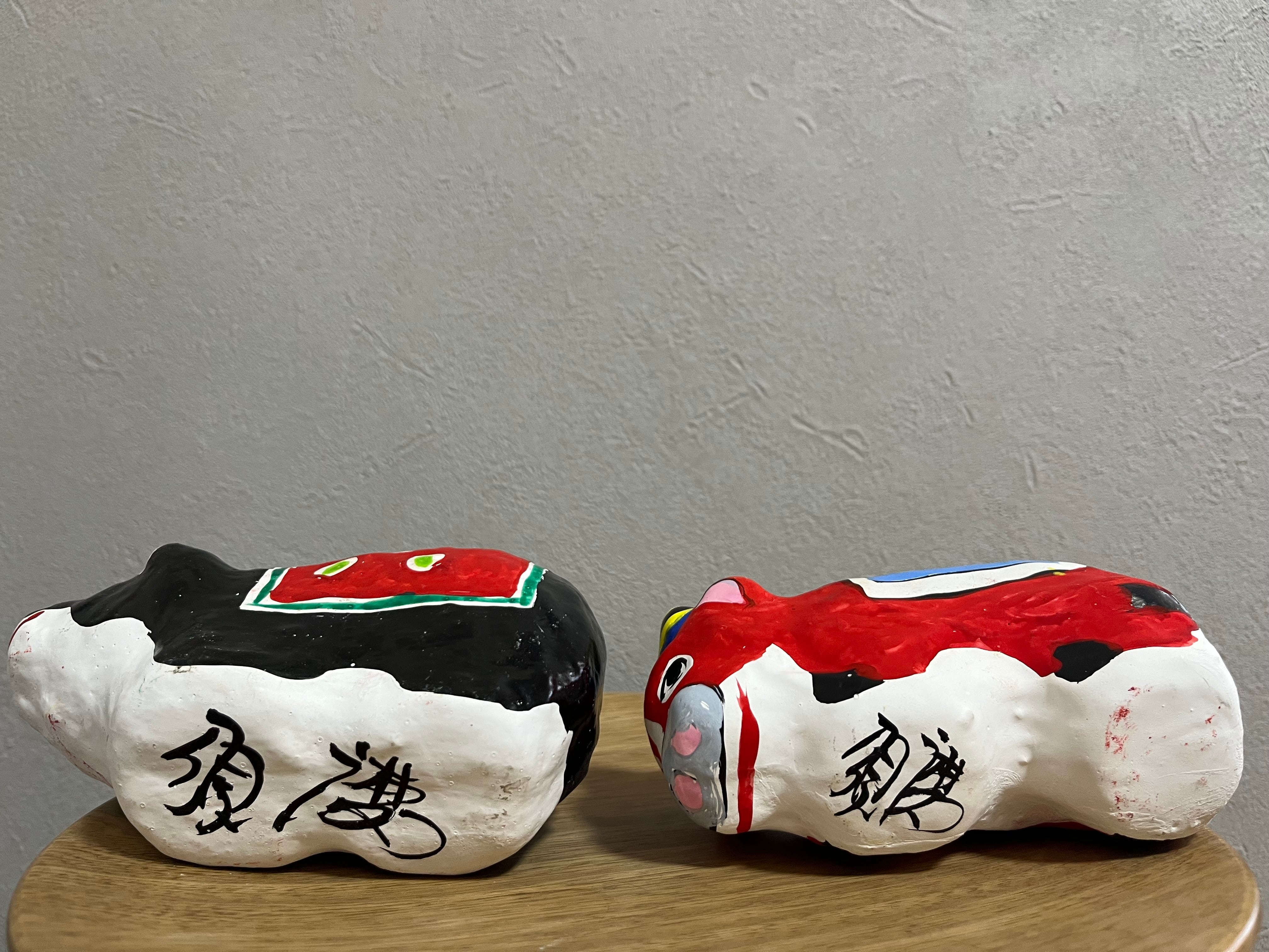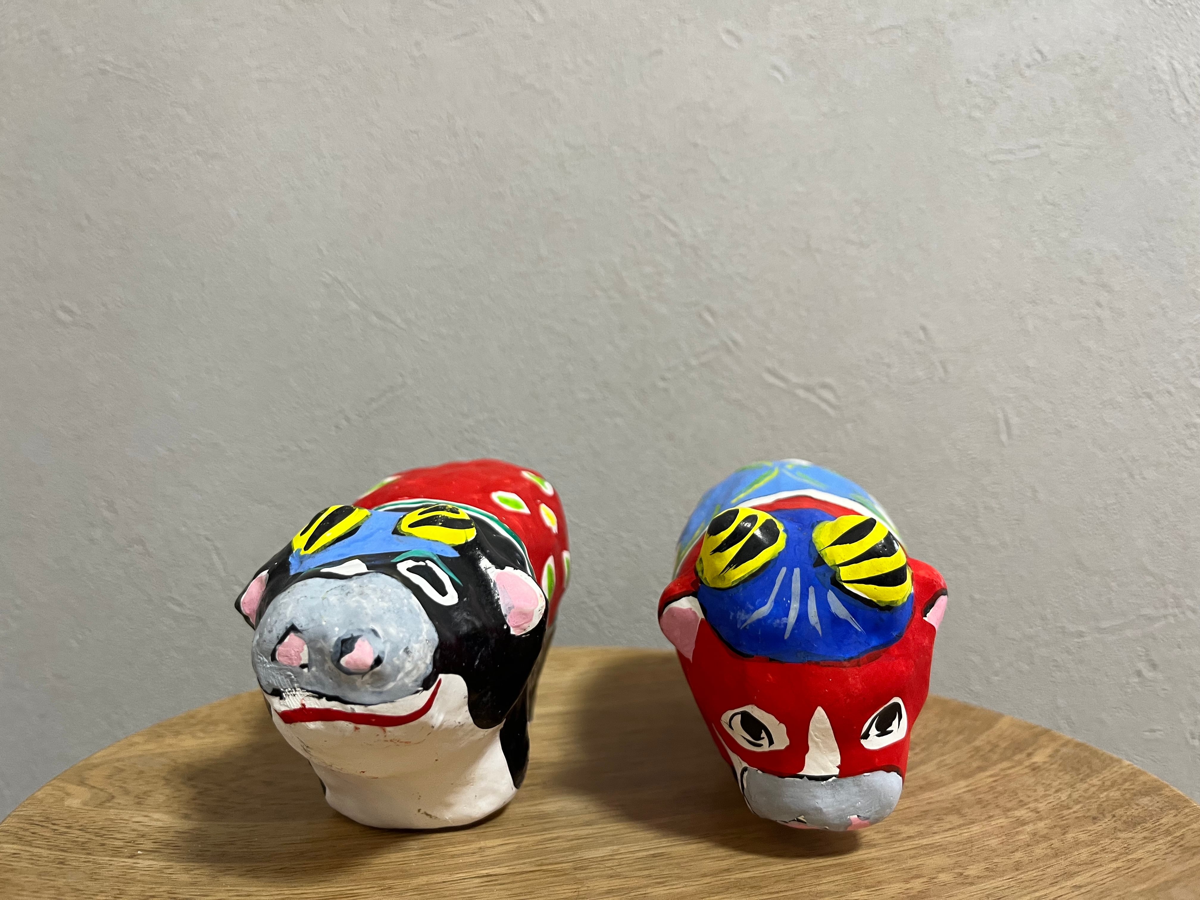 華やかな布をみにまとった赤牛と黒牛。赤い牛(赤べこ)は縁起物と言われています。
