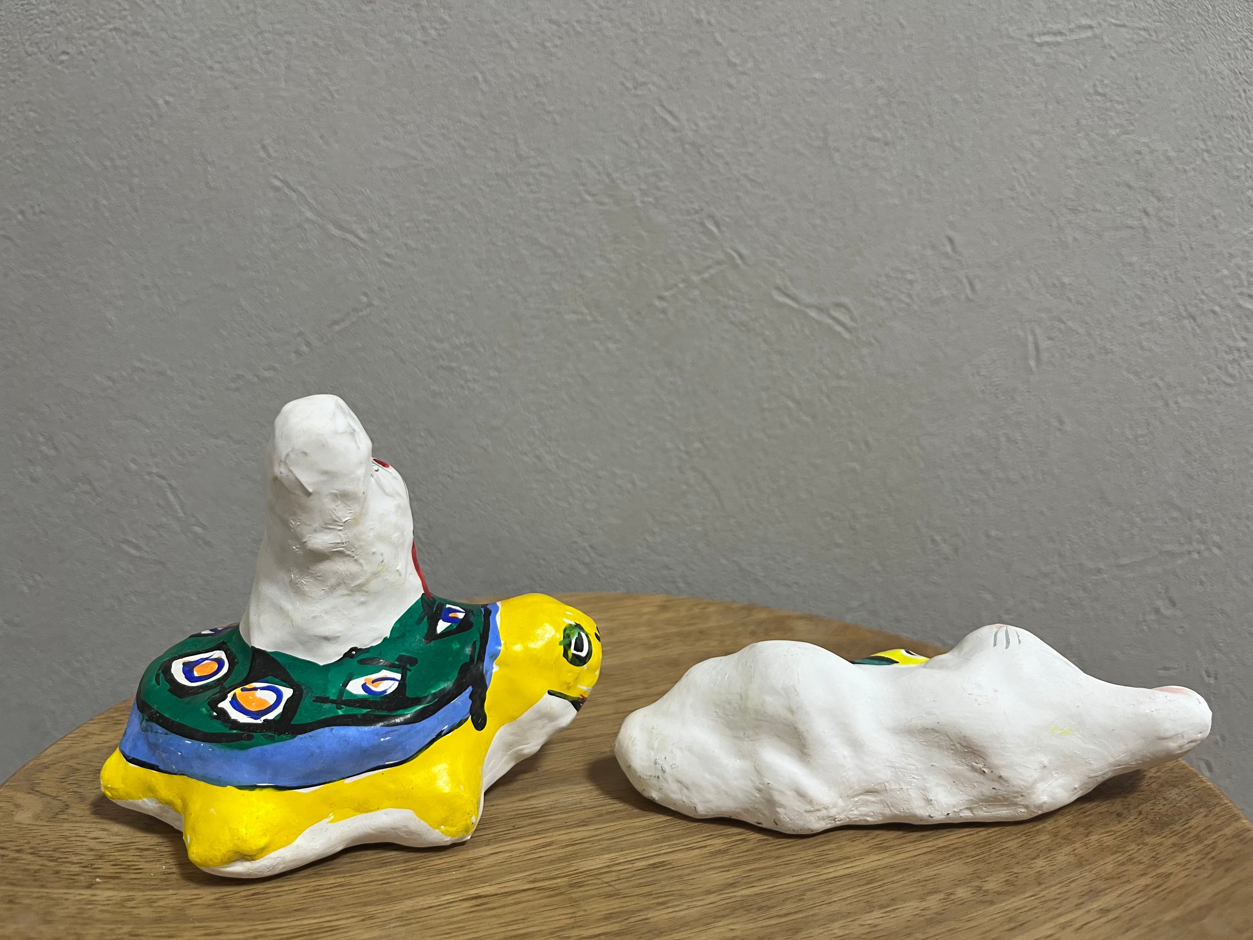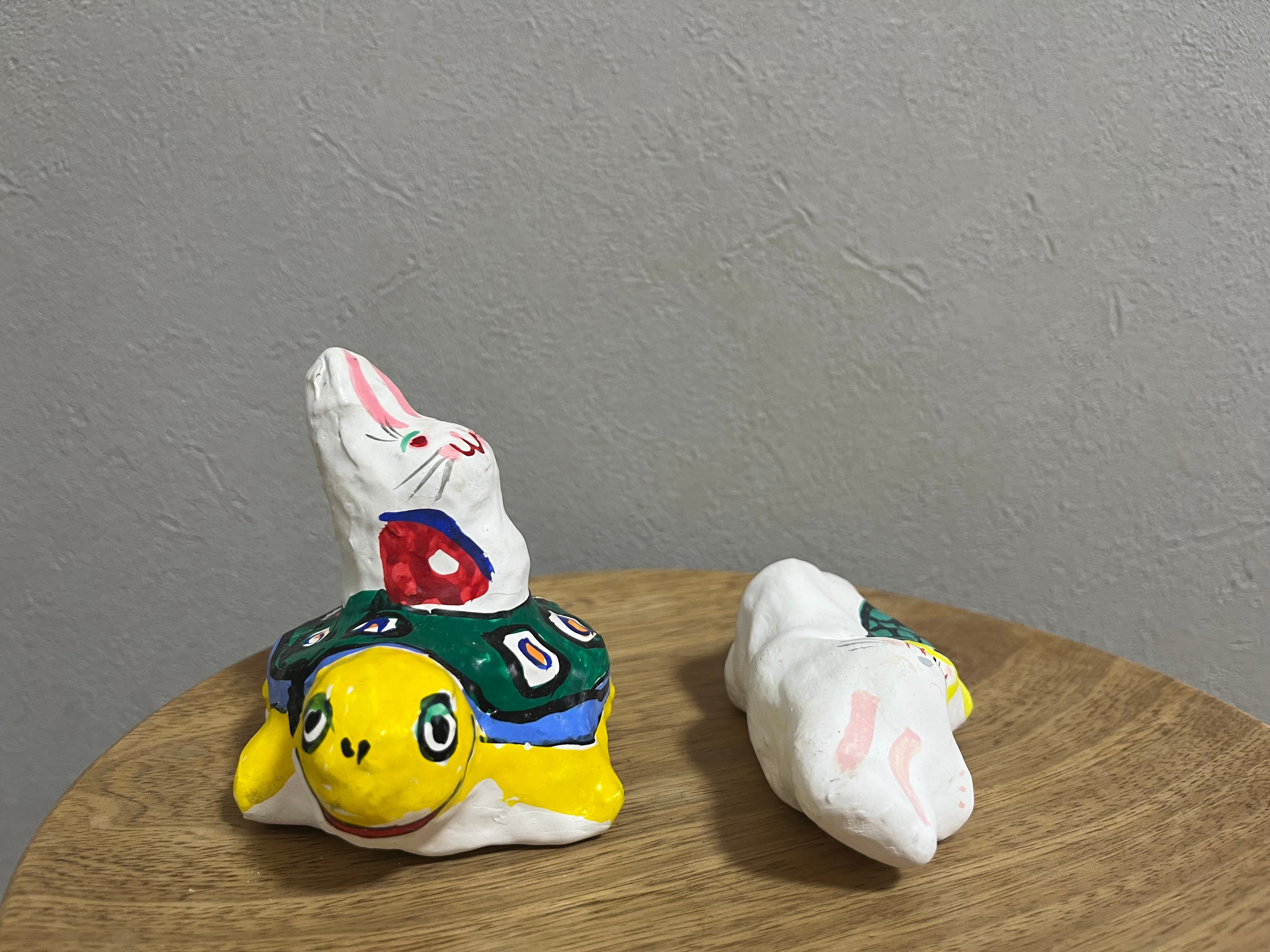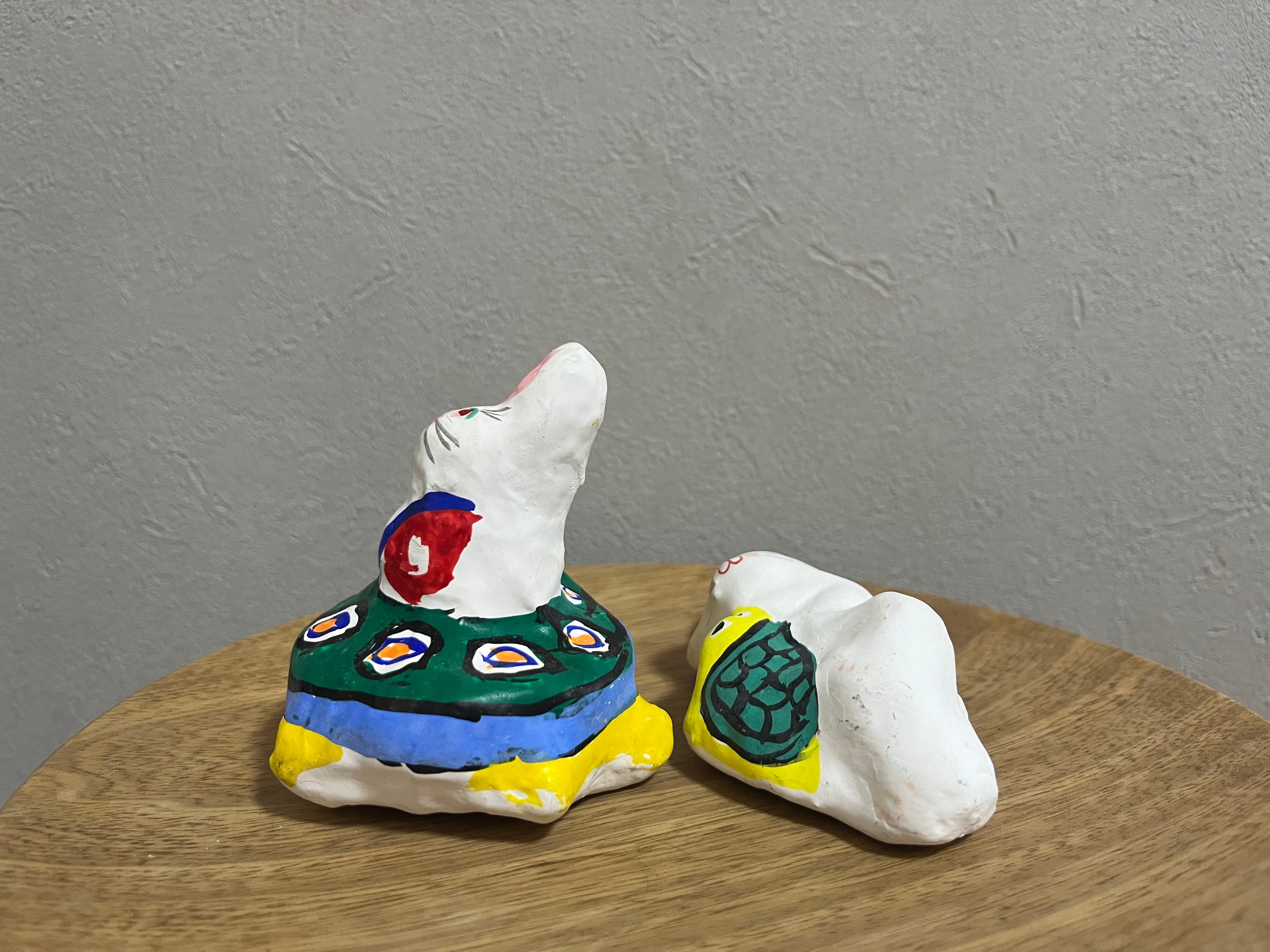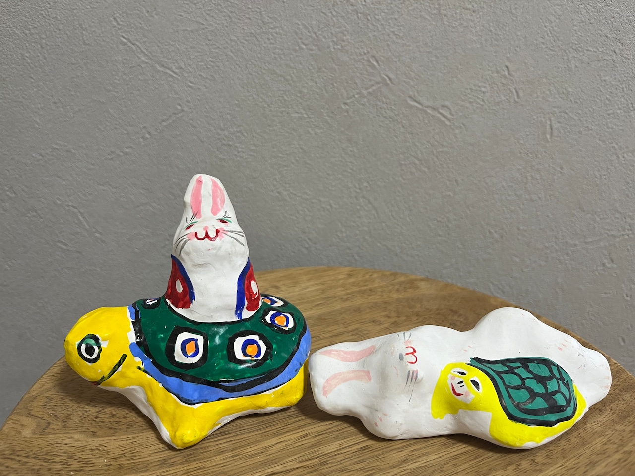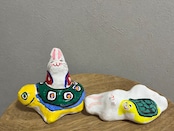 亀の上に乗るうさぎは、実際の物語にはないシーンですが、仲良さそうで可愛いです。
