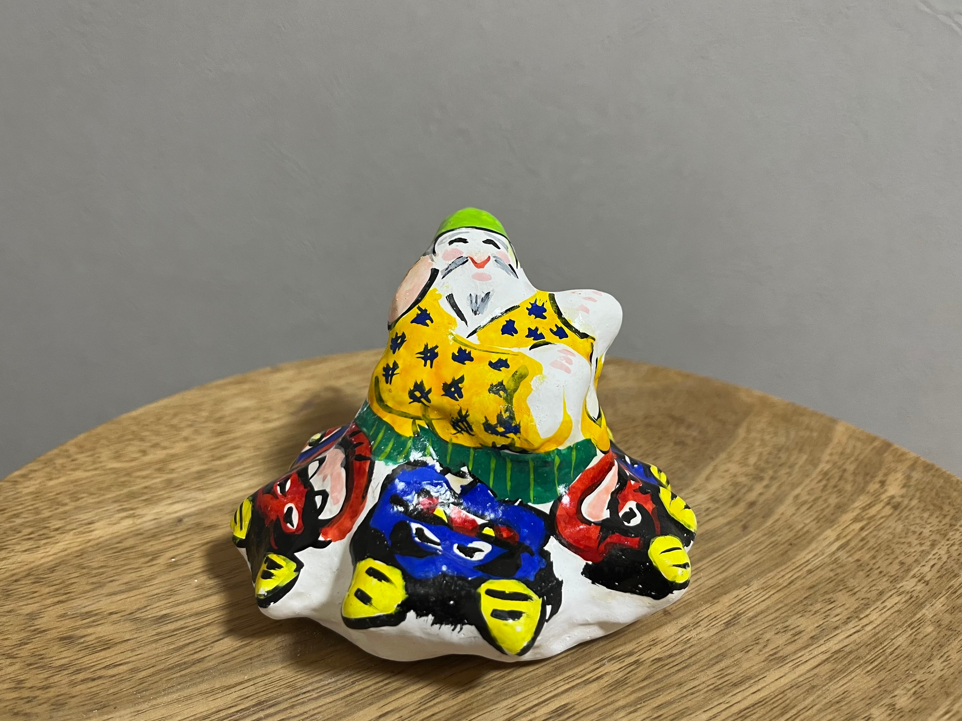5匹の鬼の上で得意げな表情を浮かべるおじいさん。