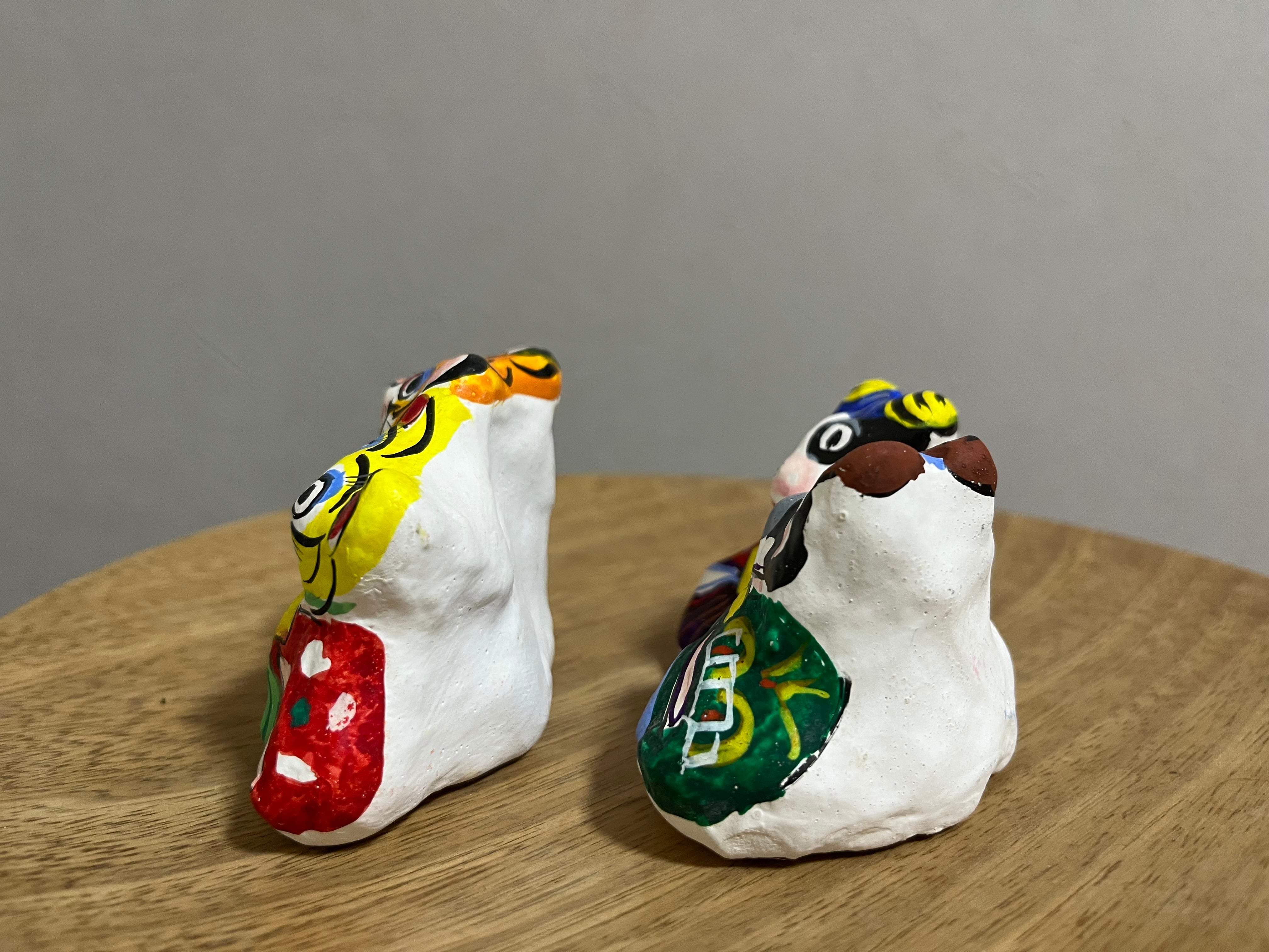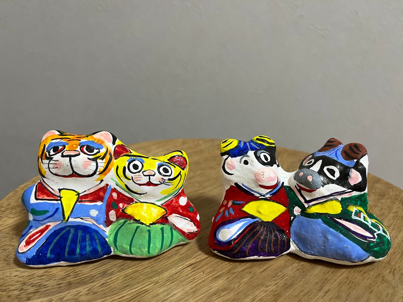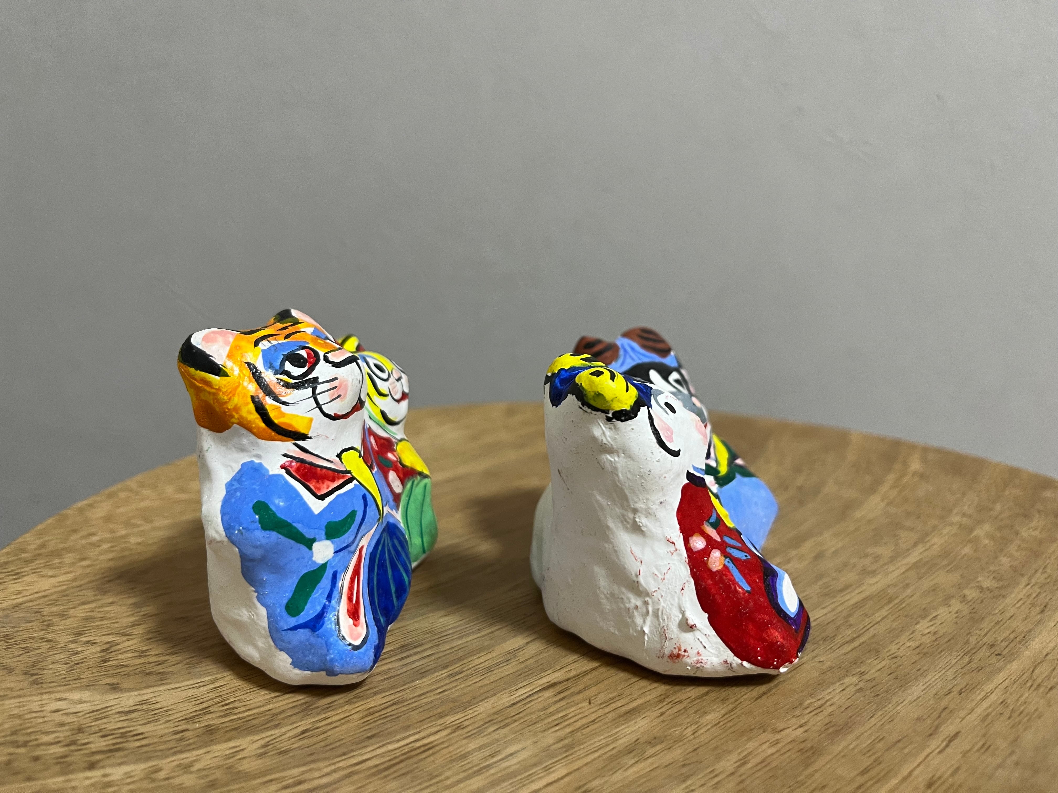 楽しそうな表情を浮かべるトラと牛のひな人形。春らしい着物を身にまとった華やかな作品。