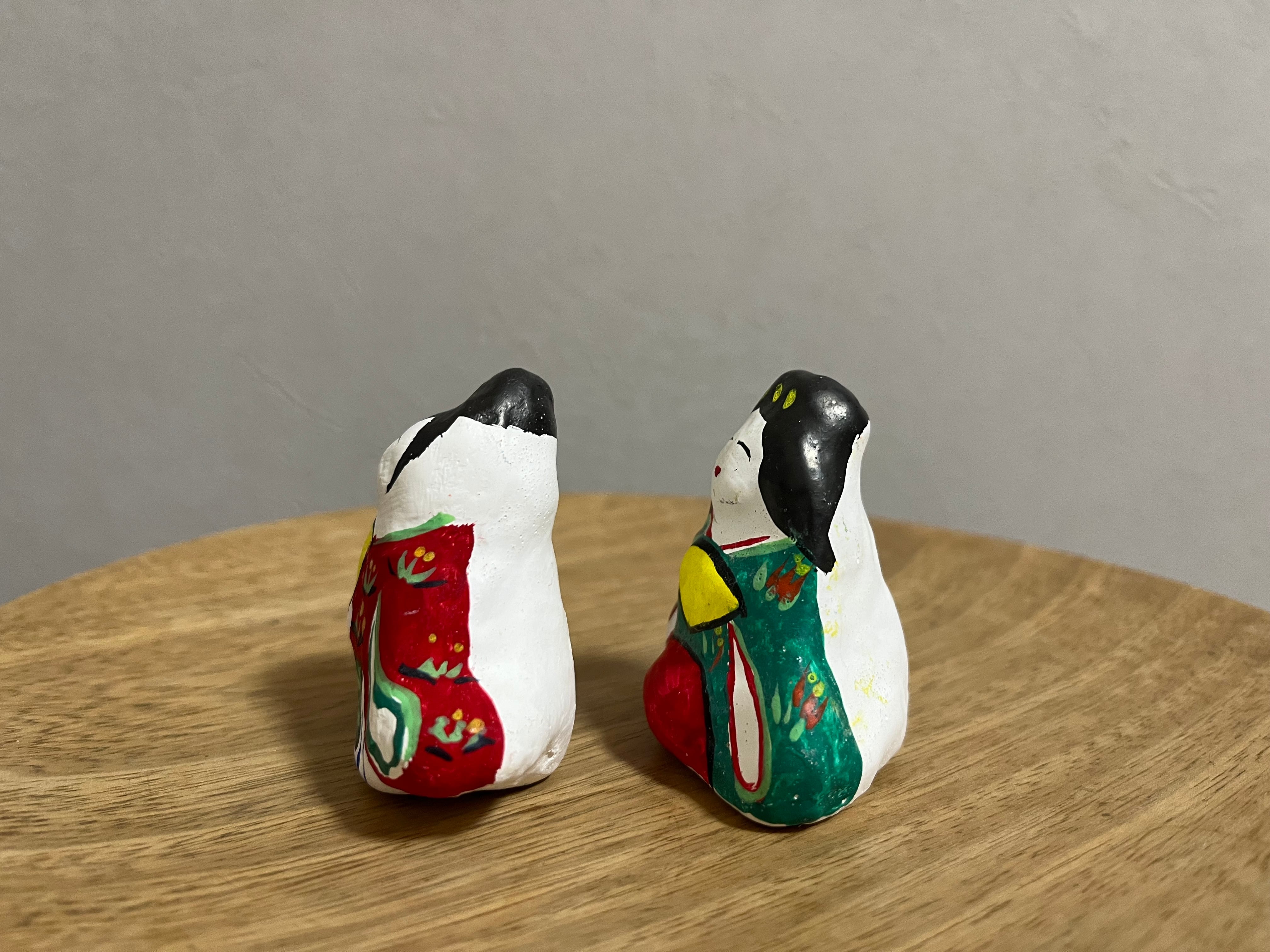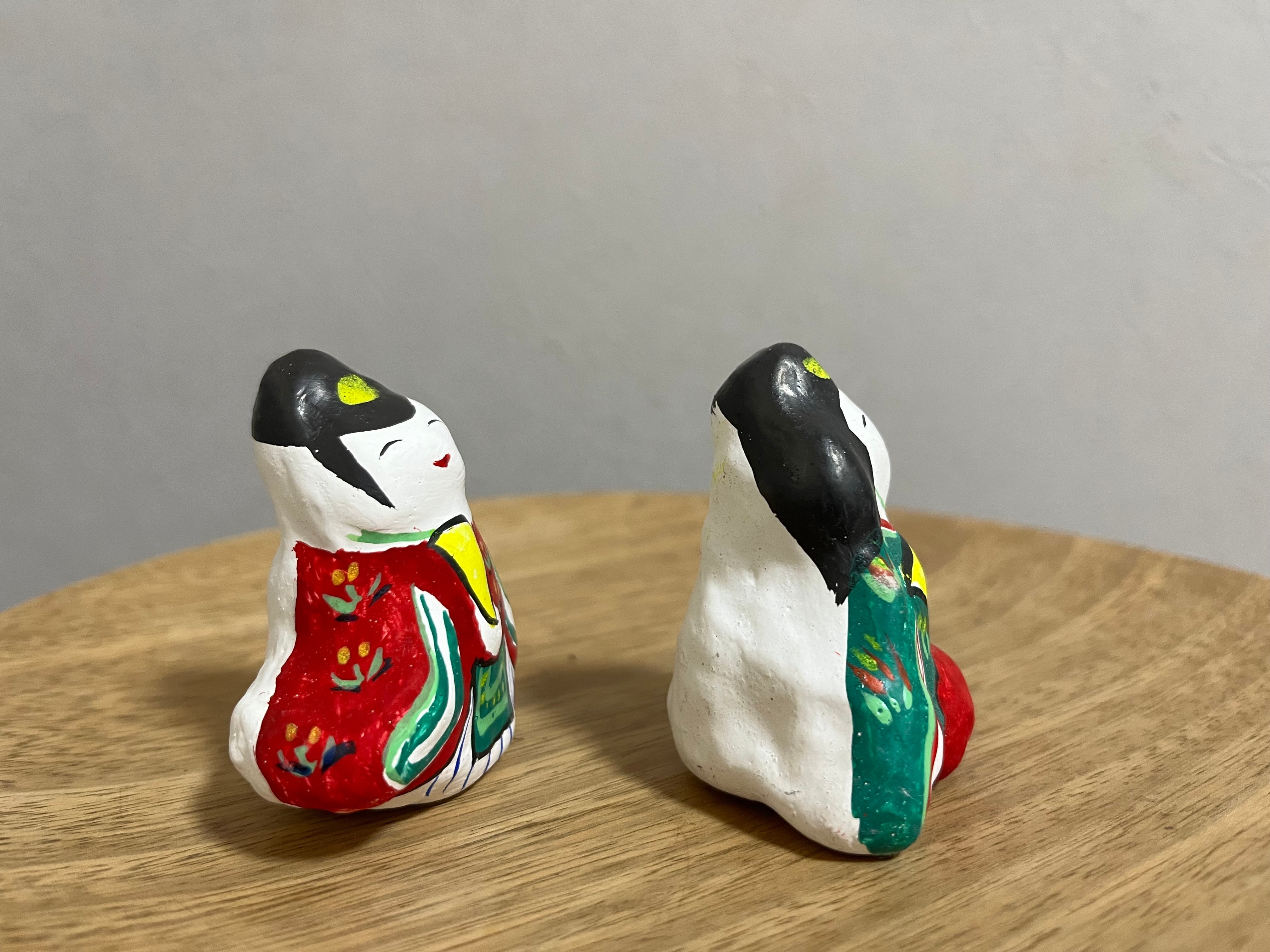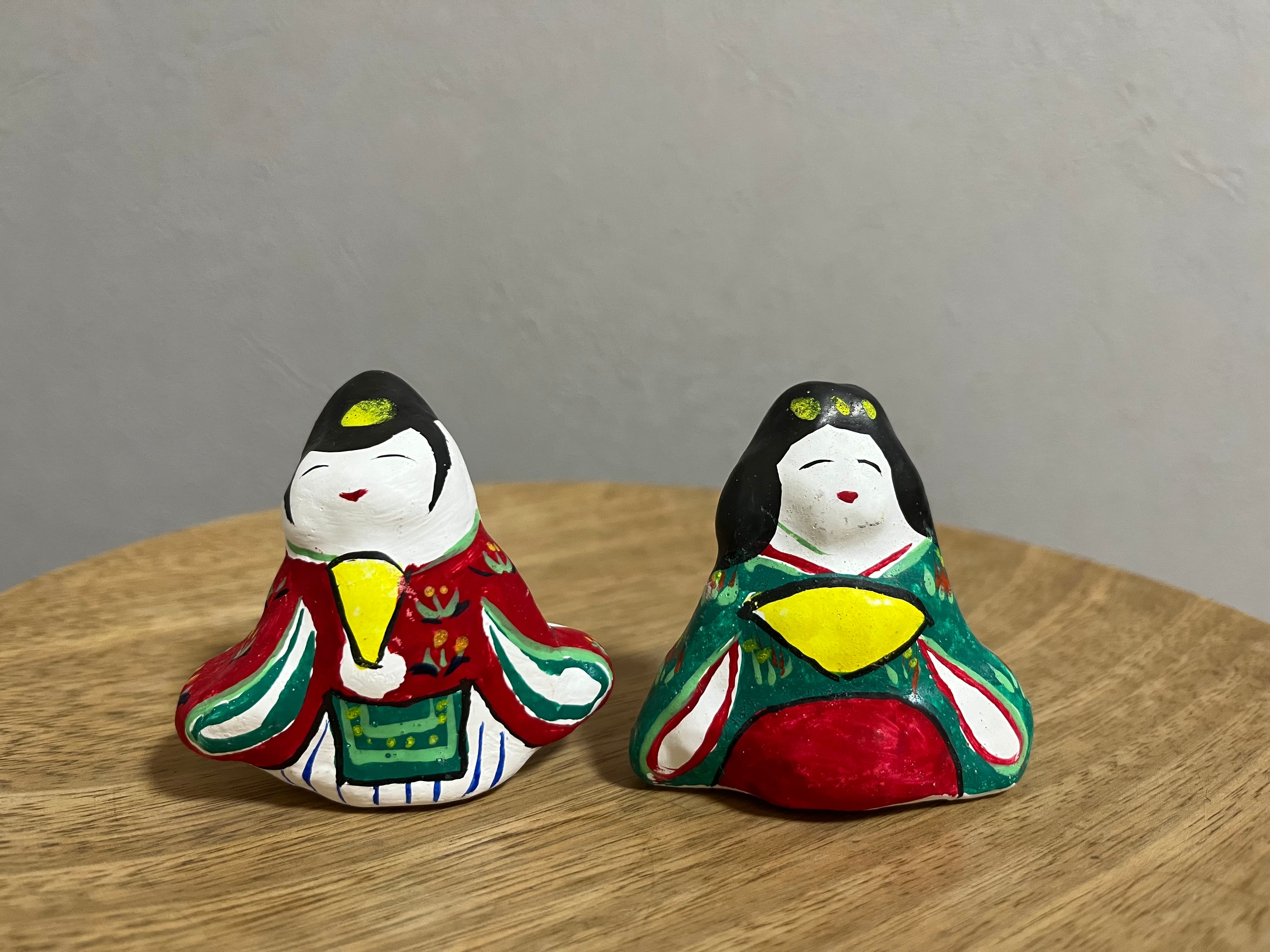 可愛らしい花柄の着物を身にまとい、にこやかな表情を浮かべる二人飾りのひな人形。気軽に飾れるサイズ感です。