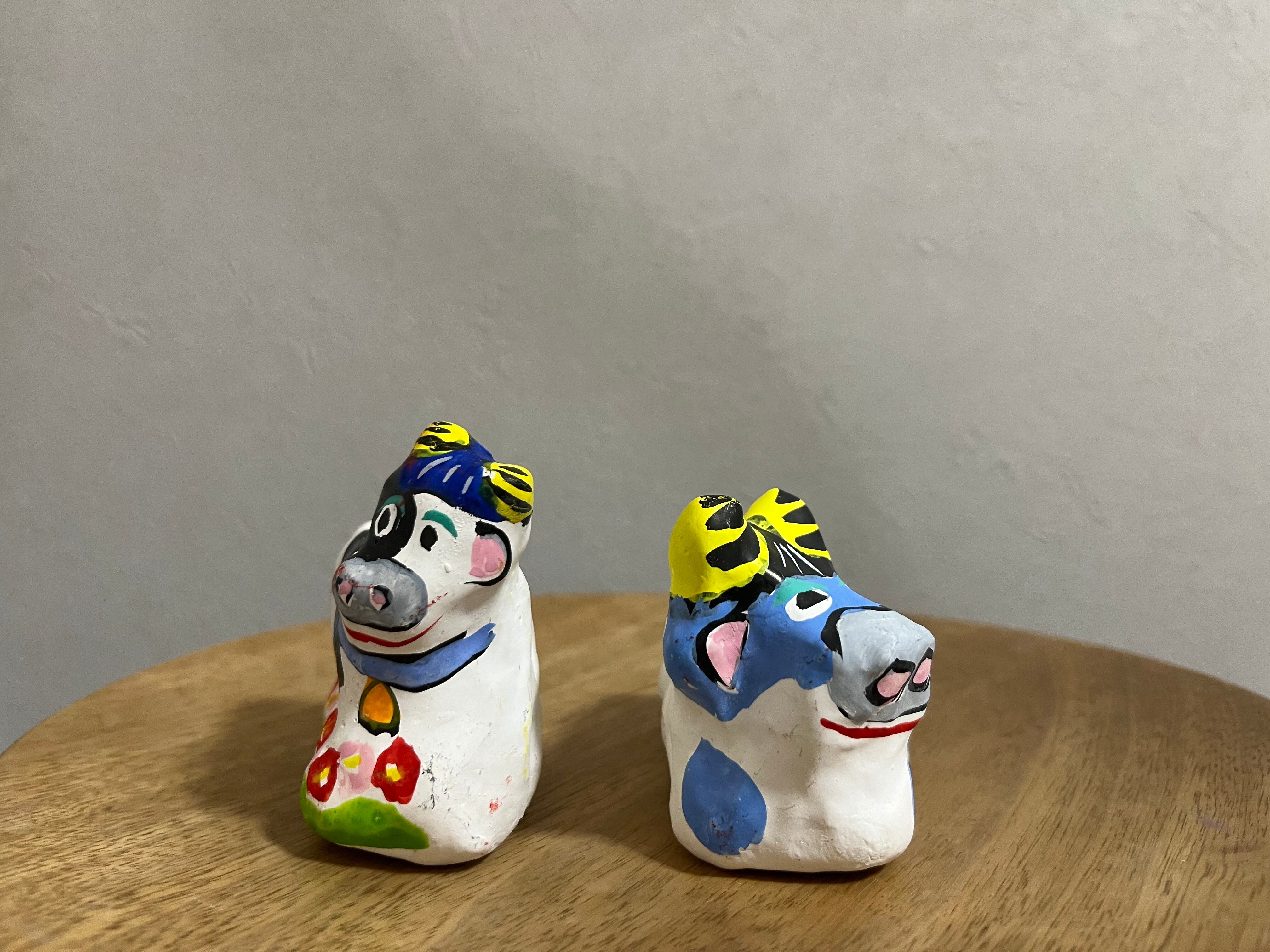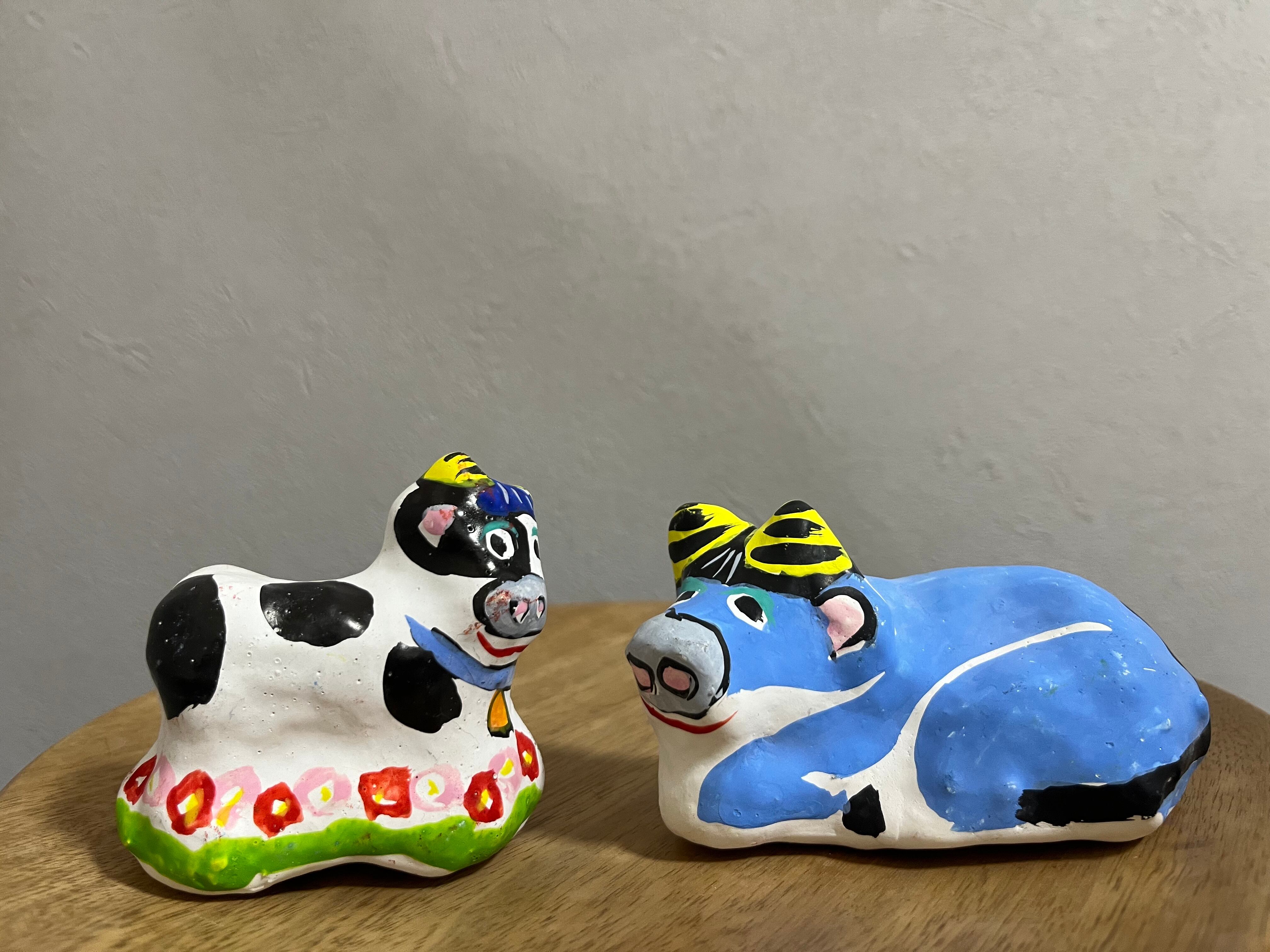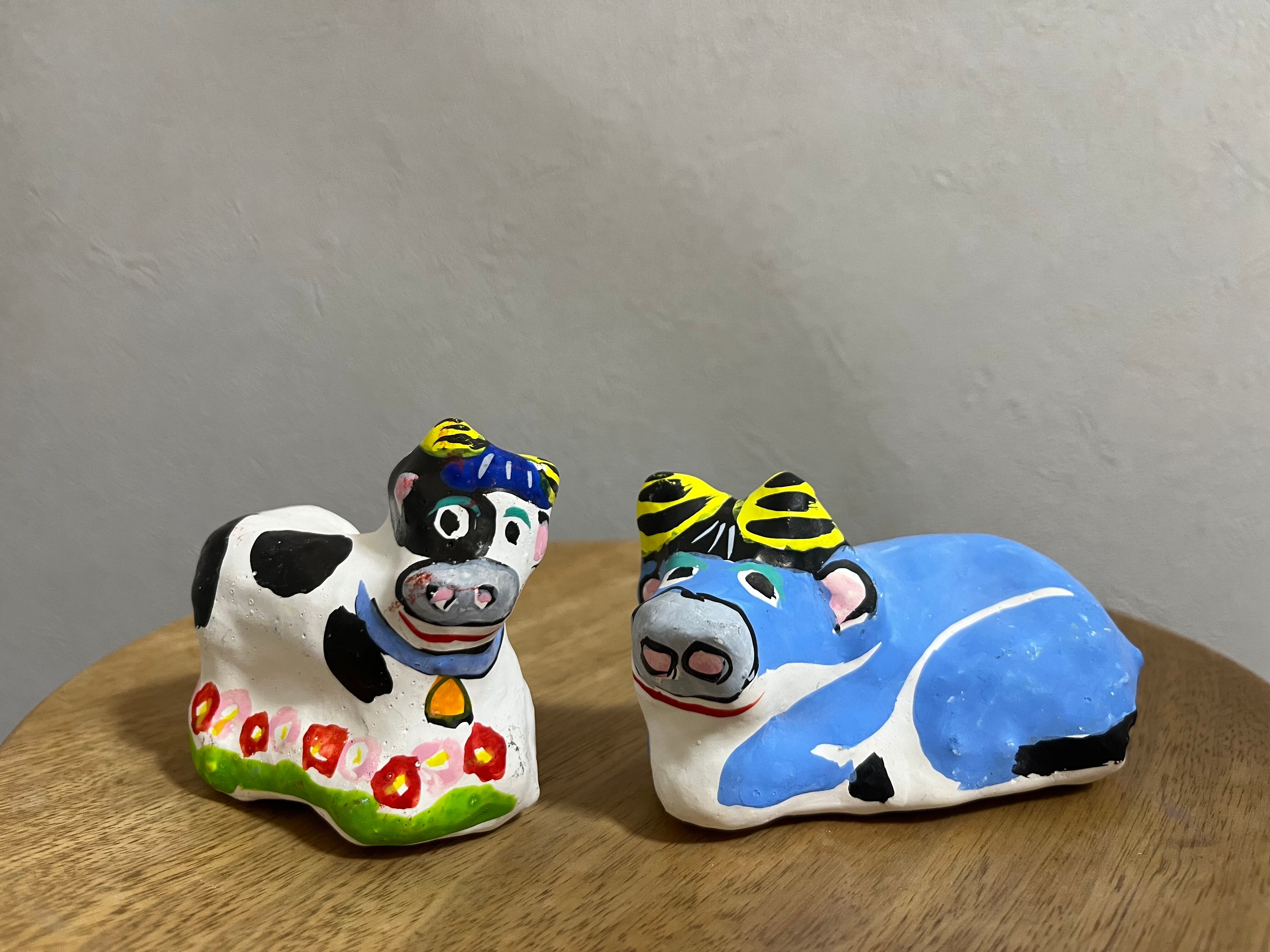 花畑の中に立つ牛と、爽やかなスカイブルーの牛の、春らしいデザインのセット。