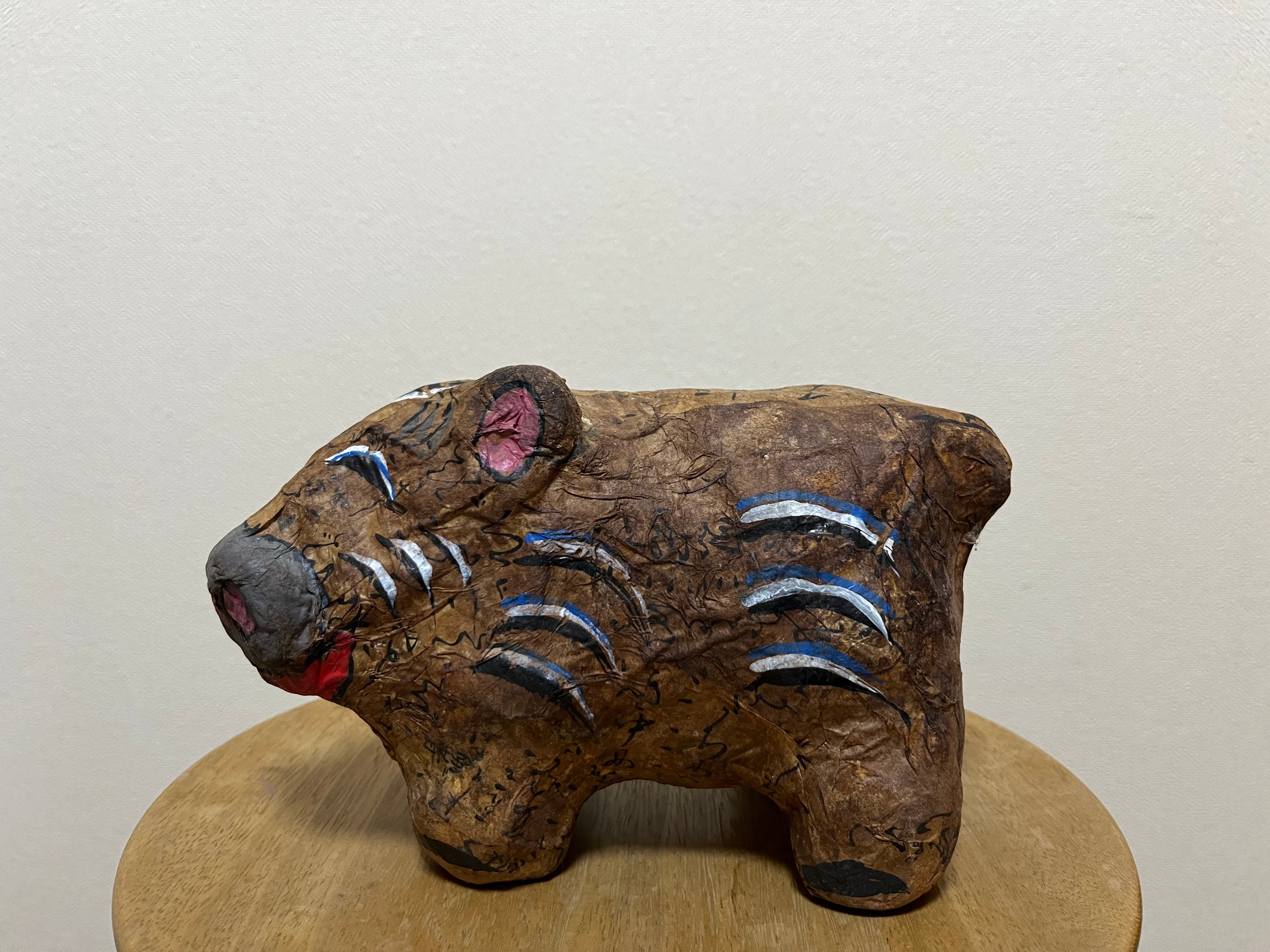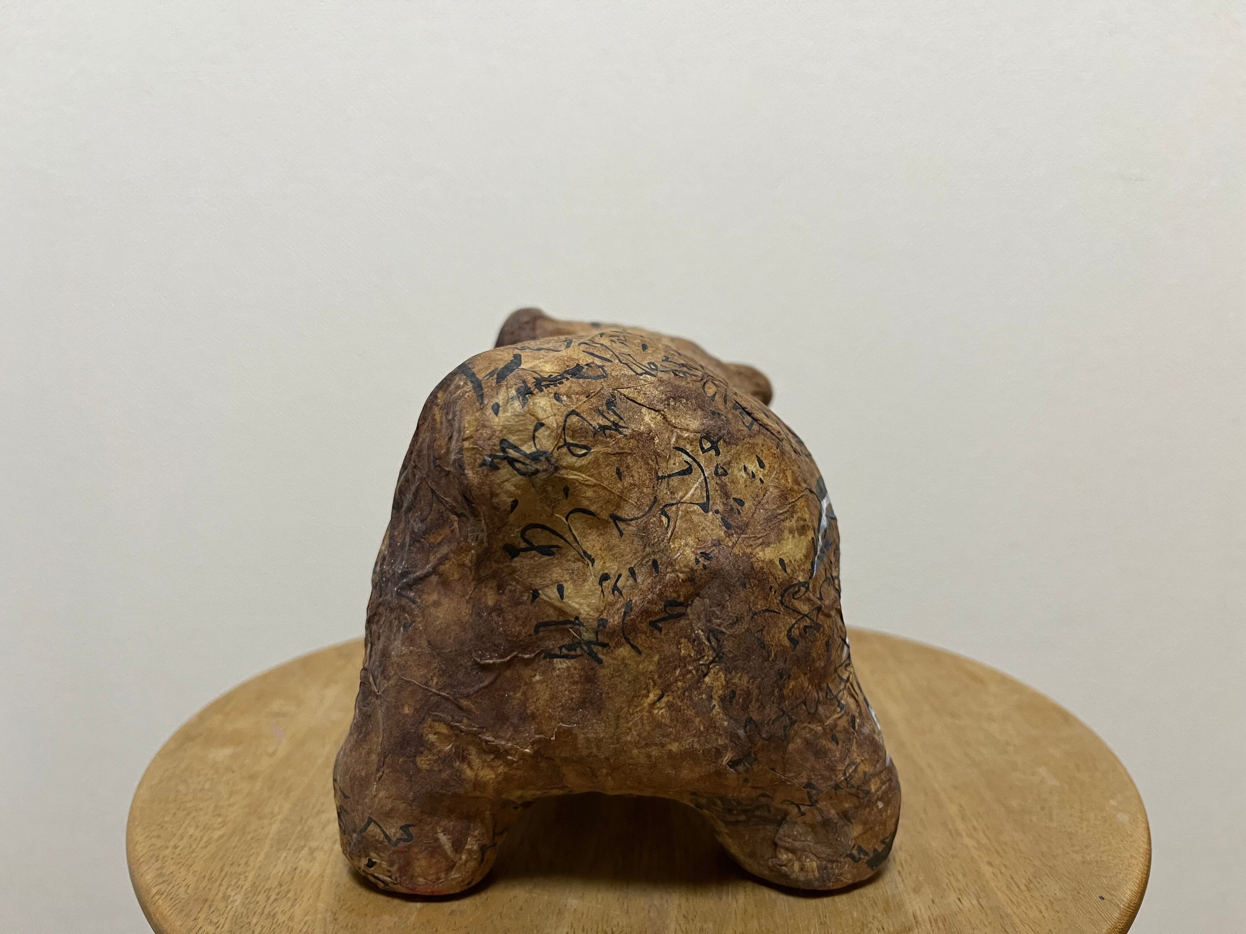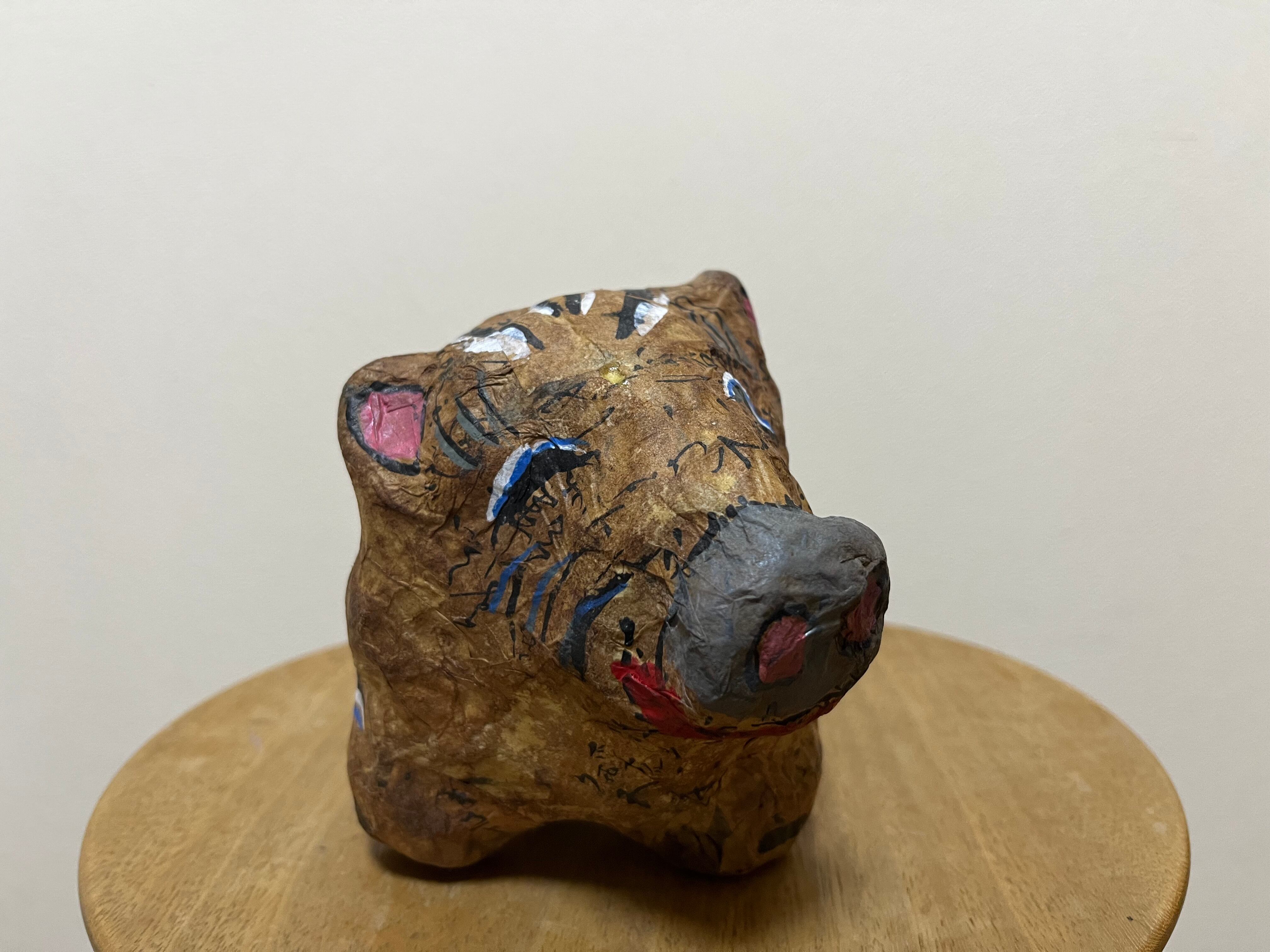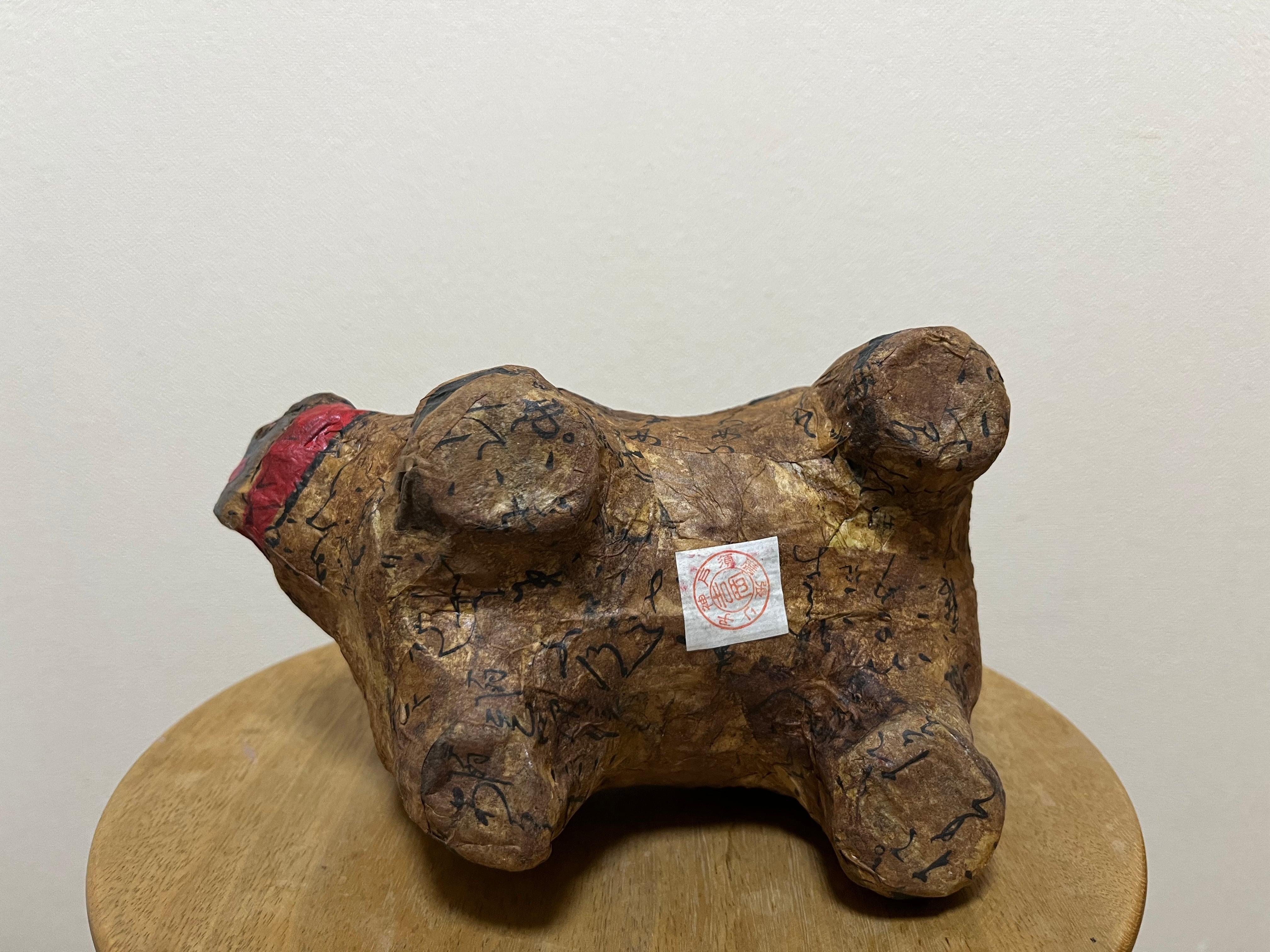 表面を胡粉ではなく柿渋で仕上げた珍しい作品。通常の張り子との質感の違いや、より軽いのが特徴です。下の和紙の文字が透けて見えるのも面白いです!
