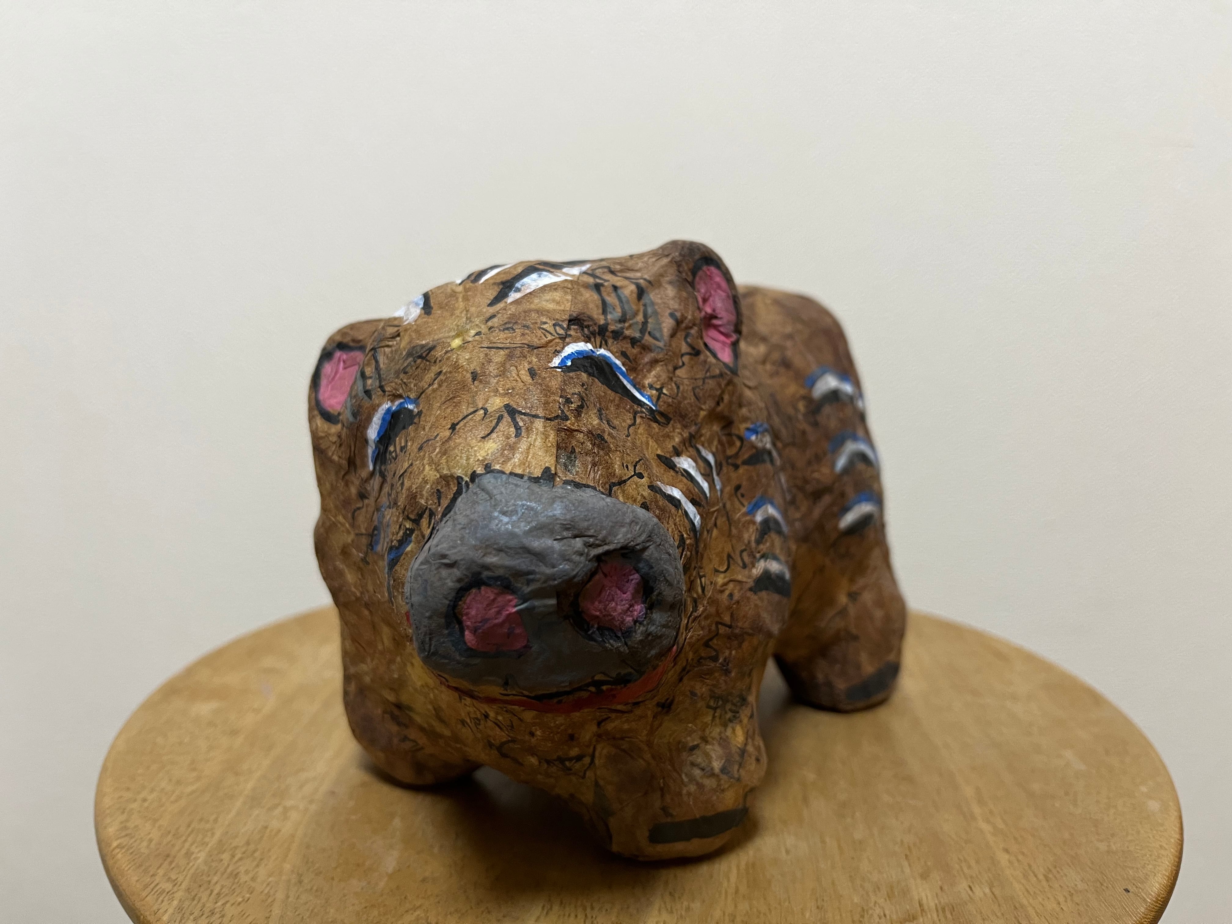 ニコニコかわいい大きなイノシシ。柿渋の渋い色味に白と青のラインが映えます。
